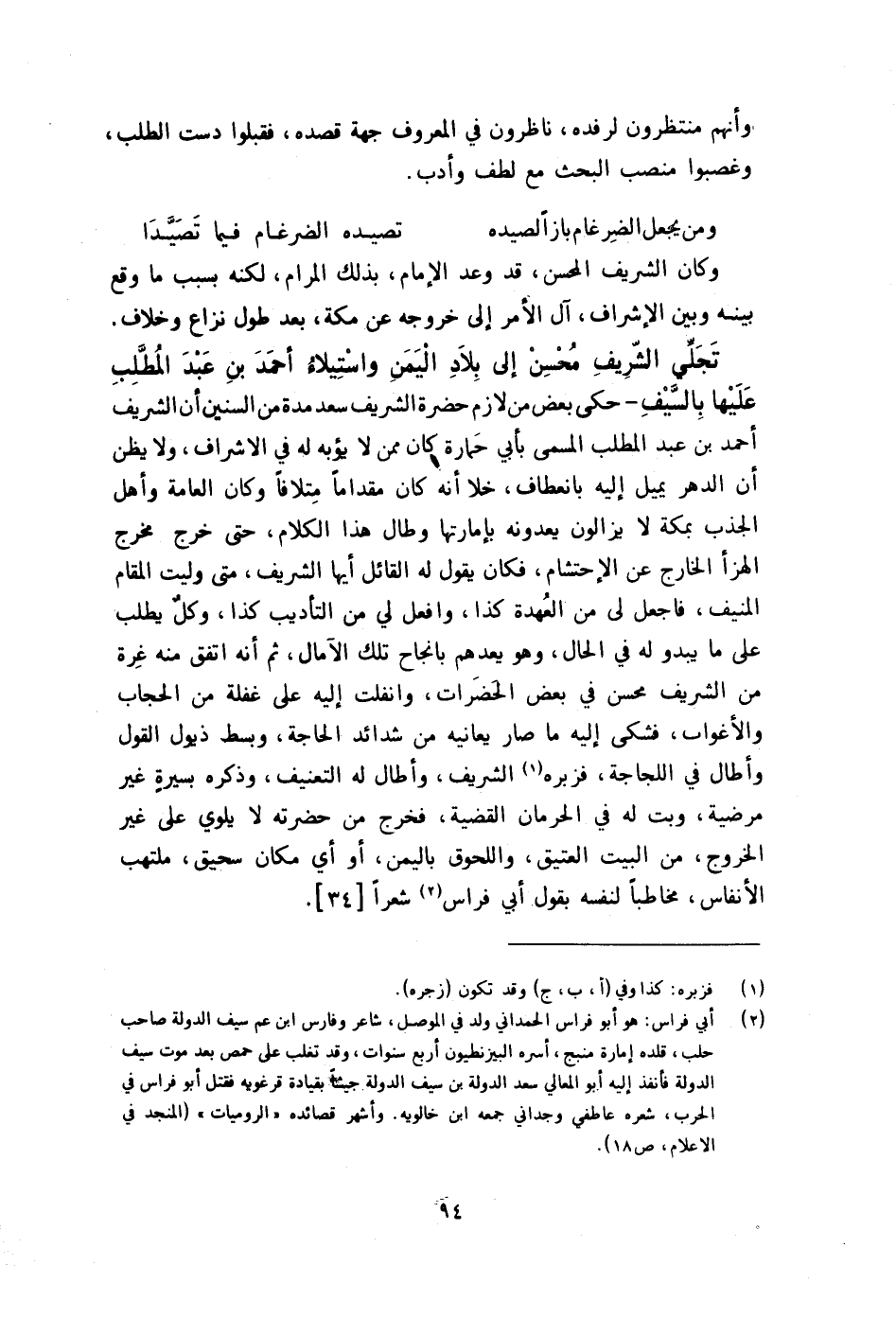 تجلي الشريف محسن إِلَى بِلَاد الْيمن واستيلاء أَحْمد بن عبد الْمطلب عَلَيْهَا بِالسَّيْفِ حكى بعض من لَازم حَضْرَة الشريف سعد مُدَّة من السنين أَن الشريف أَحْمد بن عبد الْمطلب الْمُسَمّى بِأبي حمارة كَانَ مِمَّن لَا يؤبه لَهُ فِي الاشراف وَلَا يظنّ أَن الدَّهْر يمِيل إِلَيْهِ بانعطاف خلا أَنه كَانَ مقداما متلافا وَكَانَ الْعَامَّة وَأهل الجذب بِمَكَّة لَا يزالون يعدونه بإمارتها وَطَالَ هَذَا الْكَلَام حَتَّى خرج مخرج الهزأ الْخَارِج عَن الإحتشام فَكَانَ يَقُول لَهُ الْقَائِل أَيهَا الشريف مَتى وليت الْمقَام المنيف فَاجْعَلْ لى من الْعهْدَة كَذَا وَافْعل لي من التَّأْدِيب كَذَا وكل يطْلب على مَا يَبْدُو لَهُ فِي الْحَال وَهُوَ يعدهم بانجاح تِلْكَ الآمال ثمَّ أَنه اتّفق مِنْهُ غرَّة من الشريف محسن فِي بعض الحضرات وانفلت إِلَيْهِ على غَفلَة من الْحجاب والأغواب فَشكى إِلَيْهِ مَا صَار يعانيه من شَدَائِد الْحَاجة وَبسط ذيول القَوْل وَأطَال فِي اللجاجة فزبره الشريف وَأطَال لَهُ التعنيف وَذكره بسيرة غير مرضية وَبت لَهُ فِي الحرمان الْقَضِيَّة فَخرج من حَضرته لَا يلوي على غير الْخُرُوج من الْبَيْت الْعَتِيق واللحوق بِالْيمن أَو أَي مَكَان سحيق ملتهب الأنفاس مُخَاطبا لنَفسِهِ بقول أبي فراس شعرًا