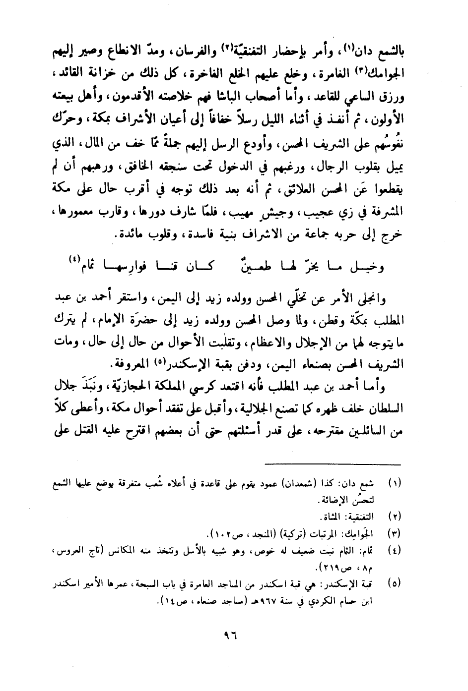 بالشمع دَان وَأمر بإحضار التفنقية والفرسان وَمد الانطاع وصير إِلَيْهِم الجوامك الغامرة وخلع عَلَيْهِم الْخلْع الفاخرة كل ذَلِك من خزانَة الْقَائِد ورزق السَّاعِي للقاعد وَأما أَصْحَاب الباشا فهم خلاصته الأقدمون وَأهل بيعَته الْأَولونَ ثمَّ أنفذ فِي أثْنَاء اللَّيْل رسلًا خفافا إِلَى أَعْيَان الْأَشْرَاف بِمَكَّة وحرك نُفُوسهم على الشريف المحسن وأودع الرُّسُل إِلَيْهِم جملَة مِمَّا خف من المَال الَّذِي يمِيل بقلوب الرِّجَال ورغبهم فِي الدُّخُول تَحت سنجقه الخافق ورهبهم أَن لم يقطعوا عَن المحسن العلائق ثمَّ أَنه بعد ذَلِك توجه فِي أقرب حَال على مَكَّة المشرفة فِي زِيّ عَجِيب وجيش مهيب فَلَمَّا شَارف دورها وقارب معمورها خرج إِلَى حربه جمَاعَة من الاشراف بنية فَاسِدَة وَقُلُوب مائدة