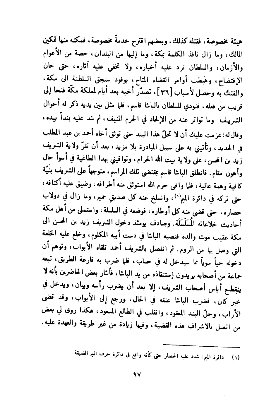 هَيْئَة مَخْصُوصَة فَقتله كَذَلِك وَبَعْضهمْ اقترح خدمَة مَخْصُوصَة فمكنه مِنْهَا تَمْكِين الْمَالِك وَمَا زَالَ نَافِذ الْكَلِمَة بِمَكَّة وَمَا إِلَيْهَا من الْبلدَانِ حِصَّة من الأعوام والأزمان وَالسُّلْطَان ترد عَلَيْهِ أخباره وَلَا تخفي عَلَيْهِ آثاره حَتَّى حَان الإفتضاح وهبطت أوَامِر الْقَضَاء المتاح بوفود سنجق الساطنة الى مَكَّة والفتك بِهِ وَحصل لأسباب تصدر أَخِيه بعد أَيَّام لمملكة مَكَّة فنحا إِلَى قريب من فعله فَنُوديَ للسُّلْطَان بالباشا قَاسم فَلَمَّا مثل بَين يَدَيْهِ ذكر لَهُ أَحْوَال الشريف وَمَا تَوَاتر عَنهُ من الْإِلْحَاد فِي الْحرم المنيف ثمَّ شدّ عَلَيْهِ بندا بِيَدِهِ وَقَالَ لَهُ عزمت عَلَيْك أَن لَا تحل هَذَا البند حَتَّى توثق أَخَاهُ أَحْمد بن عبد الْمطلب فِي الْحَدِيد وتأتيني بِهِ على سَبِيل الْمُبَادرَة بِلَا مزِيد بعد أَن تقر ولَايَة الشريف زيد بن المحسن على ولَايَة بَيت الله الْحَرَام وتوافيني بِهَذَا الطاغية فِي أَسْوَأ حَال وأهون مقَام فَانْطَلق الباشا قَاسم بِمُقْتَضى تِلْكَ المراسم مُتَوَجها على الشريف بنية كَافِيَة وهمة عالية فَلَمَّا وافى حرم الله استوثق مِنْهُ أَطْرَافه وضيق عَلَيْهِ أكنافه حَتَّى تَركه فِي دَائِرَة الْمِيم وانسلخ عَنهُ كل صديق حميم وَمَا زَالَ فِي دولاب حصاره حَتَّى قضى مِنْهُ كل أوطاره فَوَضعه فِي السلسلة واستملى من أهل مَكَّة أَحَادِيث خلاعاته المسلسلة وصادف يَوْمئِذٍ دُخُول الشريف زيد بن المحسن الى مَكَّة عقيب موت وَالِده فنصبه الباشا فِي دست أَبِيه المكلوم وخلع عَلَيْهِ الخلعة الَّتِي وصل بهَا من الرّوم ثمَّ انْفَصل بالشريف أَحْمد تِلْقَاء الْأَبْوَاب وتوهم أَن دُخُوله حَيا سويا مِمَّا سيدخل لَهُ فِي حِسَاب فَلَمَّا ضرب بِهِ قَارِعَة الطَّرِيق تبعه جمَاعَة من أَصْحَابه يُرِيدُونَ إستنقاذه من يَد الباشا فَأَشَارَ بعض الْحَاضِرين بِأَنَّهُ لَا يَنْقَطِع أياس أَصْحَاب الشريف إِلَّا بعد أَن يضْرب رَأسه ويبان وَيدخل فِي خبر كَانَ فَضرب الباشا عُنُقه فِي الْحَال وَرجع إِلَى الْأَبْوَاب وَقد قضى الأراب وَحل البند الْمَعْقُود وانقلب فِي االطالع المسعود هَكَذَا روى لي بعض من اتَّصل بالاشراف هَذِه الْقَضِيَّة وفيهَا زِيَادَة من غير طَريقَة والعهدة عَلَيْهِ