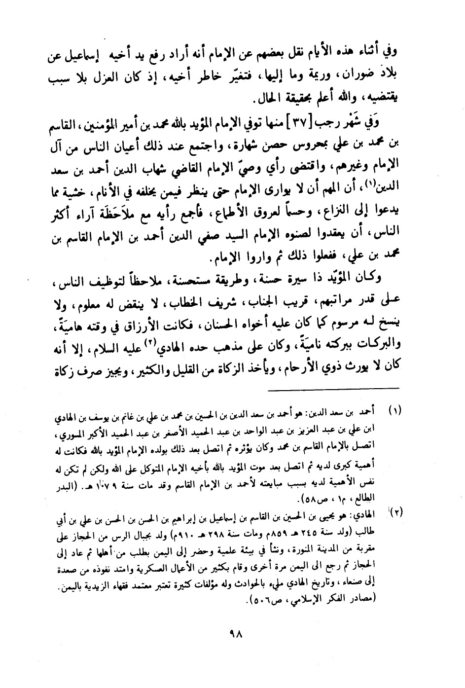 وَفِي شهر رَجَب مِنْهَا توفّي الإِمَام الْمُؤَيد بِاللَّه مُحَمَّد بن أَمِير الْمُؤمنِينَ الْقَاسِم بن مُحَمَّد بن عَليّ بمحروس حصن شهارة وَاجْتمعَ عِنْد ذَلِك أَعْيَان النَّاس من آل الإِمَام وَغَيرهم وَاقْتضى رَأْي وَصِيّ الإِمَام القَاضِي شهَاب الدّين أَحْمد بن سعد الدّين أَن المهم أَن لَا يوارى الإِمَام حَتَّى ينظر فِيمَن يخلفه فِي الْأَنَام خشيَة مِمَّا يدعوا إِلَى النزاع وحسما لعروق الأطماع فأجمع رَأْيه مَعَ مُلَاحظَة آراء أَكثر النَّاس أَن يعقدوا لصنوه الإِمَام السَّيِّد صفي الدّين أَحْمد بن الإِمَام الْقَاسِم بن مُحَمَّد بن عَليّ فَفَعَلُوا ذَلِك ثمَّ واروا الإِمَام