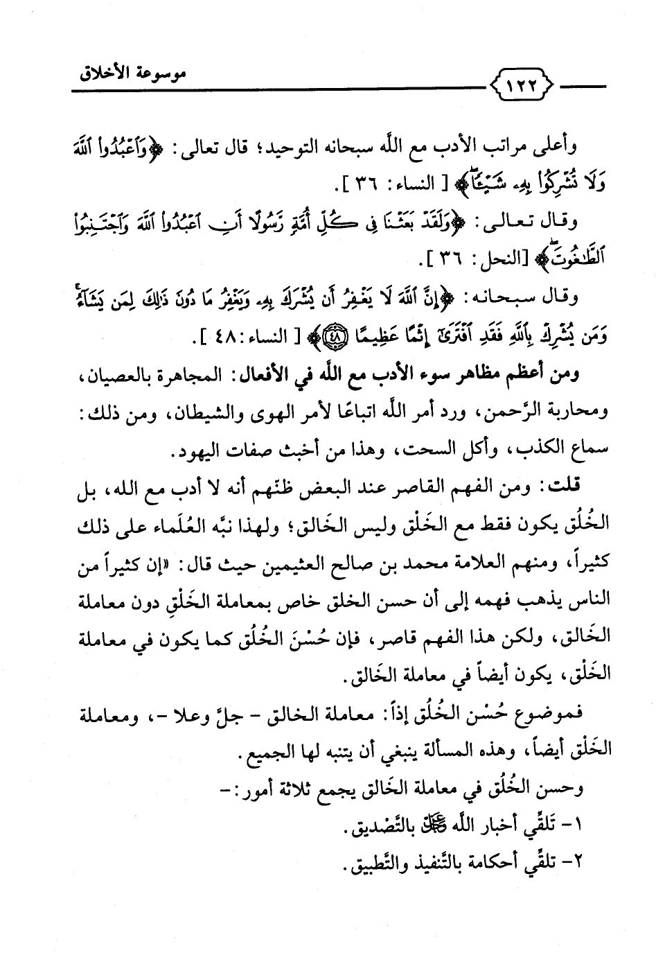 قلت: ومن الفهم القاصر عند البعض ظنّهم أنه لا أدب مع الله، بل الخُلُق يكون فقط مع الخَلق وليس الخَالق؛ ولهذا نبَّه العُلَماء على ذلك كثيراً، ومنهم العلامة محمد بن صالح العثيمين حيث قال: "إن كثيرًا من الناس يذهب فهمه إلى أن حسن الخلق خاص بمعاملة الخَلقِ دون معاملة الخَالق، ولكن هذا الفهم قاصر، فإن حُسْنَ الخُلُق كما يكون في معاملة الخَلق، يكون أيضًا في معاملة الخَالق.
