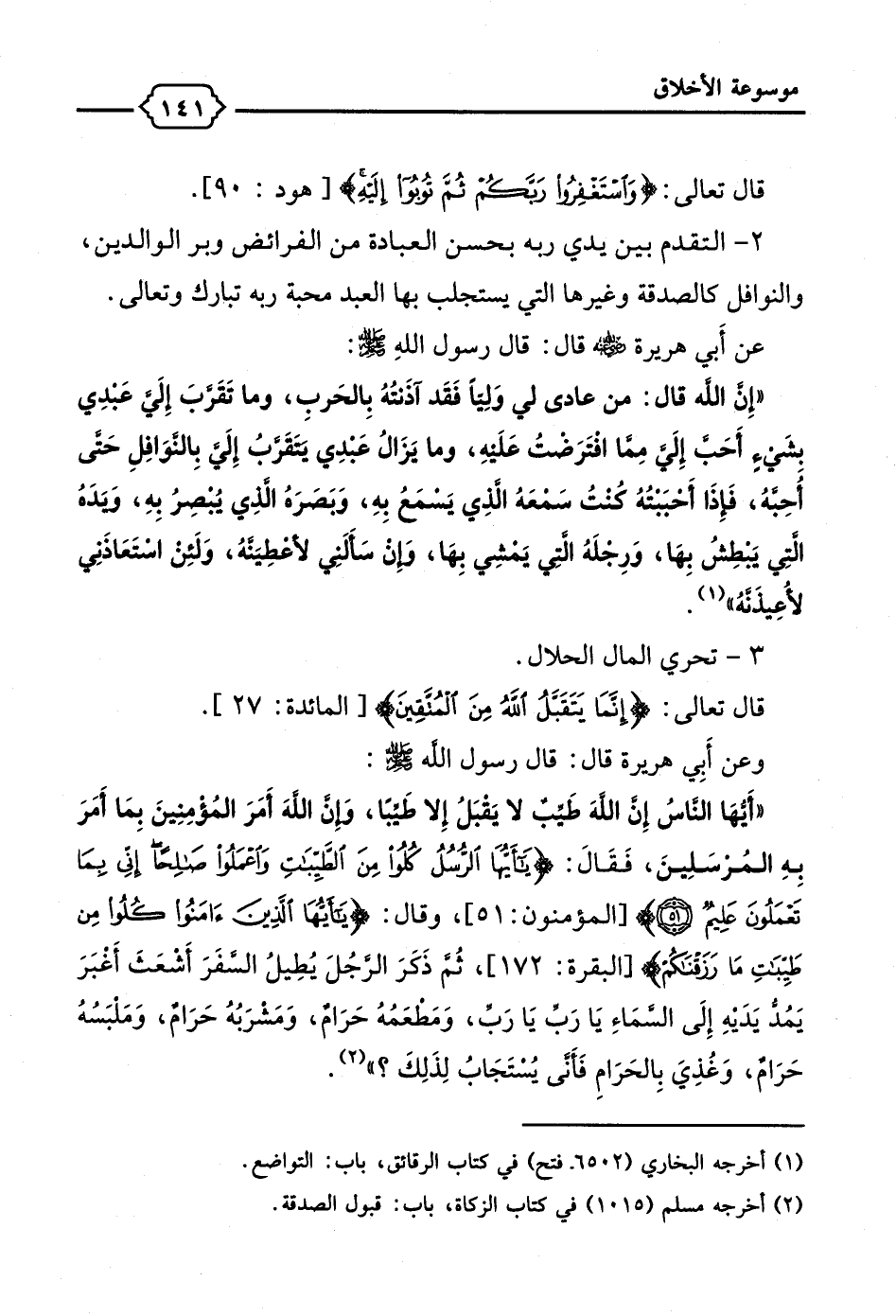 "أَيهَا النَّاسُ إِن اللهَ طَيِّبٌ لا يَقبَلُ إِلا طَيبًا، وَإِن الله أَمَرَ المُؤمِنِينَ بِمَا أَمَرَ بِهِ المُرسَلِينَ، فَقَالَ: {يَا أَيُّهَا الرُّسُلُ كُلُوا مِنَ الطَّيِّبَاتِ وَاعْمَلُوا صَالِحًا إِنِّي بِمَا تَعْمَلُونَ عَلِيمٌ (51)} [المؤمنون: 51]، وقال: {يَا أَيُّهَا الَّذِينَ آمَنُوا كُلُوا مِنْ طَيِّبَاتِ مَا رَزَقْنَاكُمْ} [البقرة: 172]، ثُم ذَكَرَ الرجُلَ يُطِيلُ السفَرَ أَشعَثَ أَغبَرَ يَمُدُّ يَدَيِه إِلَى السمَاءِ يَا رَب يَا رَب، وَمَطعَمُهُ حَرَام، وَمَشرَبُهُ حَرَام، وَمَلبَسُهُ حَرَامٌ، وَغُذِيَ بِالحَرَامِ فَأنَّى يُستجَابُ لِذَلِكَ؟ " (¬2).