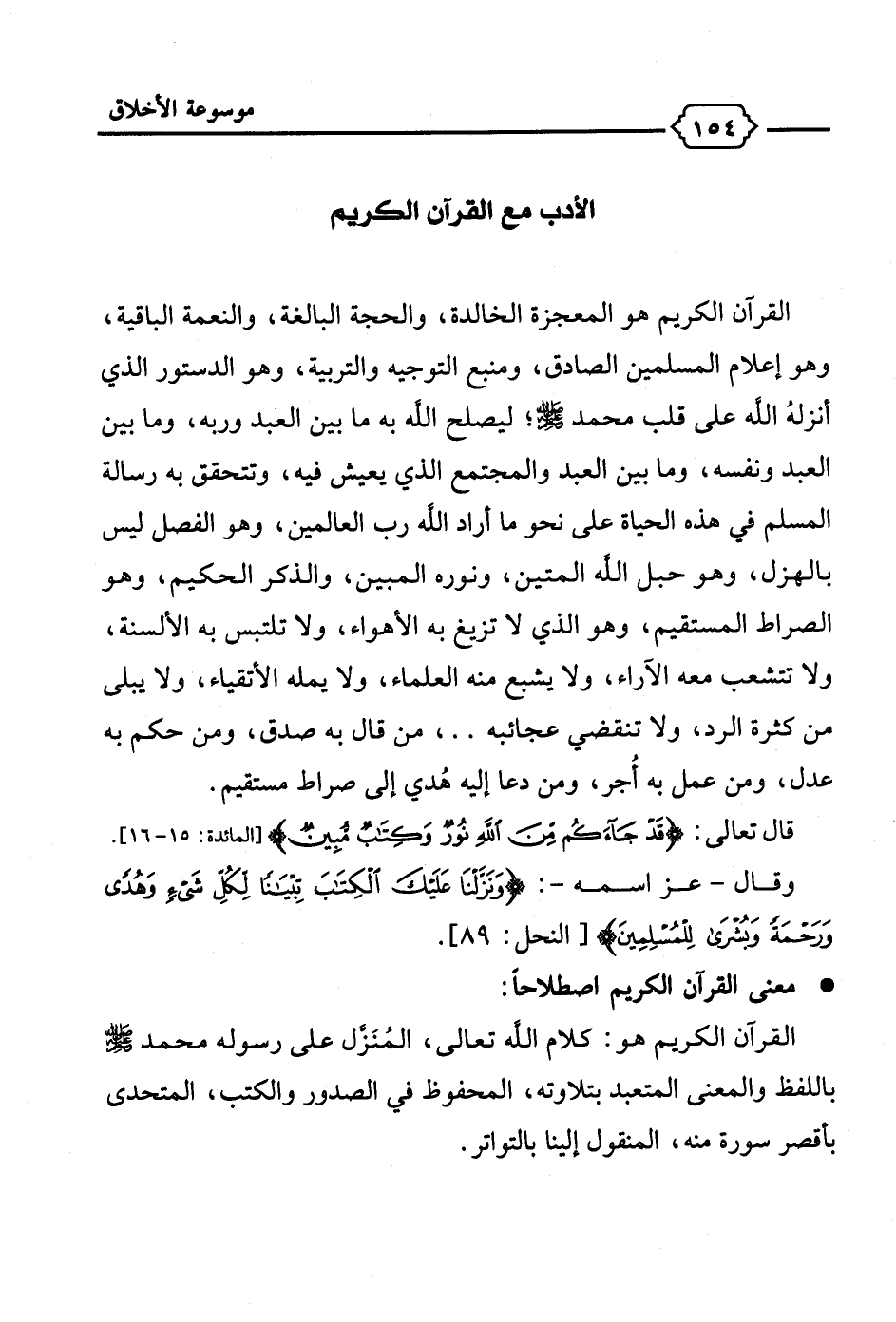 القرآن الكريم هو المعجزة الخالدة، والحجة البالغة، والنعمة الباقية، وهو إعلام المسلمين الصادق، ومنبع التوجيه والتربية، وهو الدستور الذي أنزلهُ الله على قلب محمد - صلى الله عليه وسلم -؛ ليصلح الله به ما بين العبد وربه، وما بين العبد ونفسه، وما بين العبد والمجتمع الذي يعيش فيه، وتتحقق به رسالة المسلم في هذه الحياة على نحو ما أراد الله رب العالمين، وهو الفصل ليس بالهزل، وهو حبل الله المتين، ونوره المبين، والذكر الحكيم، وهو الصراط المستقيم، وهو الذي لا تزيغ به الأهواء، ولا تلتبس به الألسنة، ولا تتشعب معه الآراء، ولا يشبع منه العلماء، ولا يمله الأتقياء، ولا يبلى من كثرة الرد، ولا تنقضي عجائبه .. ، من قال به صدق، ومن حكم به عدل، ومن عمل به أُجر، ومن دعا إليه هُدي إلى صراط مستقيم.