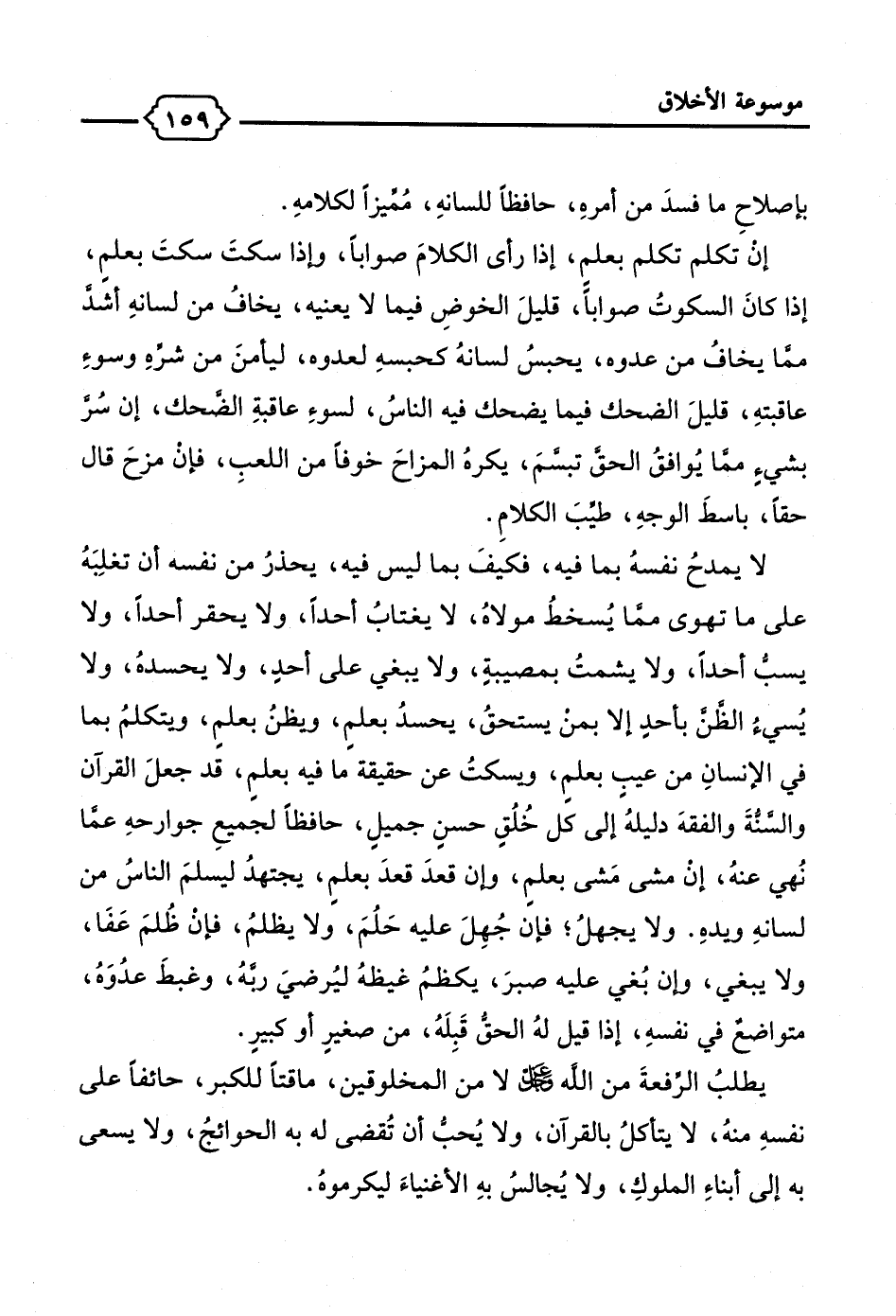لا يمدحُ نفسهُ بما فيه، فكيفَ بما ليس فيه، يحذرُ من نفسه أن تغلِبَهُ على ما تهوى مما يُسخطُ مولاهُ، لا يغتابُ أحدًا، ولا يحقر أحدًا، ولا يسبُّ أحداً، ولا يشمتُ بمصيبةِ، ولا يبغي على أحدِ، ولا يحسدهُ، ولا يُسيء الظَّنَّ بأحدٍ إلا بمن يستحقُ، يحسدُ بعلمِ، ويظنُ بعلمٍ، ويتكلمُ بما في الإنسانِ من عيبٍ بعلمِ، ويسكتُ عن حقيقة ما فيه بعلمِ، قد جعلَ القرآن والسُّنةَ والفقهَ دليلهُ إلى كل خُلُقٍ حسنِ جميلِ، حافظاً لجميعِ جوارحهِ عمَّا نُهي عنهُ، إنْ مشى مَشى بعلمِ، وإن قعدَ قعدَ بعلمِ، يجتهدُ ليسلمَ الناسُ من لسانهِ ويدهِ. ولا يجهلُ؛ فإن جُهِلَ عليه حَلُمَ، ولا يظلمُ، فإن ظُلمَ عَفَا، ولا يبغي، وإن بُغي عليه صبرَ، يكظمُ غيظهُ ليُرضيَ ربَّهُ، وغبطَ عدُوّهُ، متواضعٌ في نفسهِ، إذا قيل لهُ الحقُّ قَبِلَهُ، من صغيرٍ أو كبيرٍ.