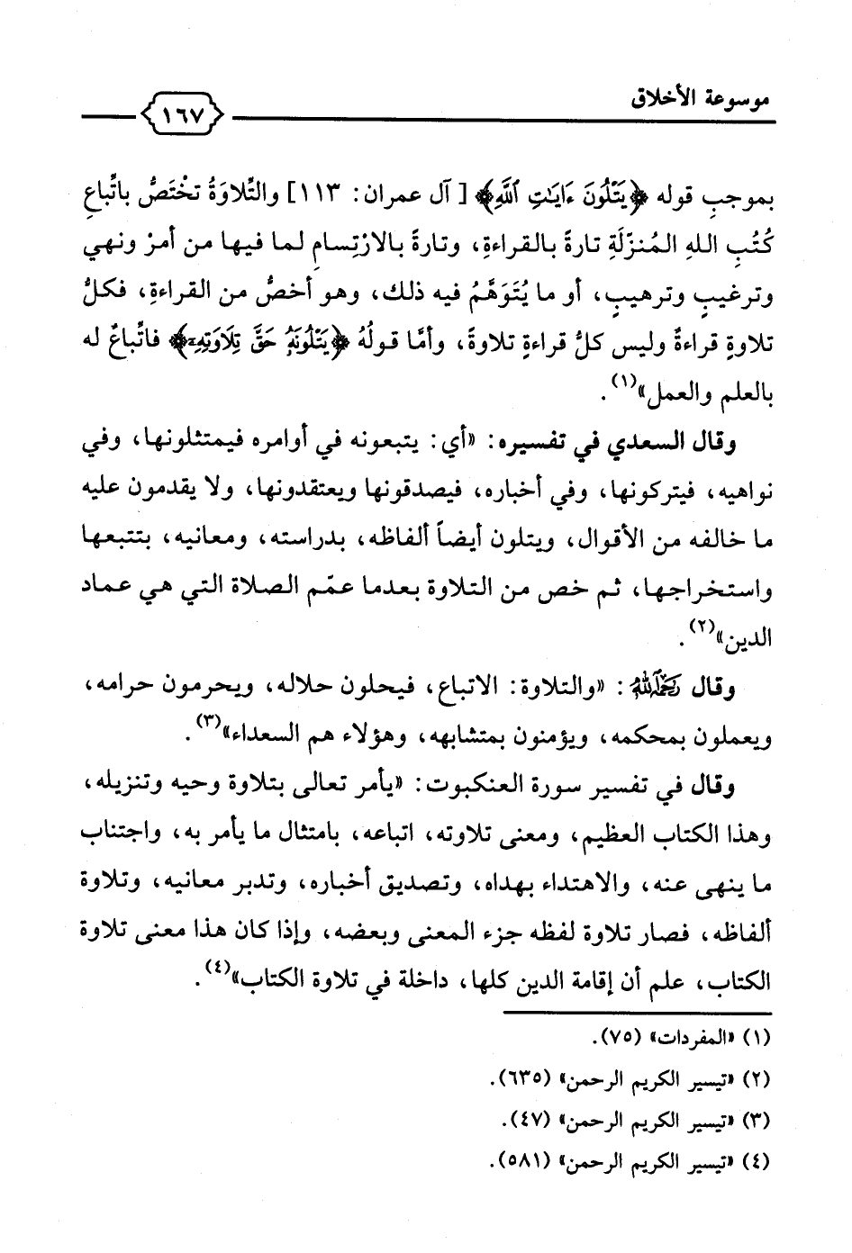 وقال في تفسير سورة العنكبوت: "يأمر تعالى بتلاوة وحيه وتنزيله، وهذا الكتاب العظيم، ومعنى تلاوته، اتباعه، بامتثال ما يأمر به، واجتناب ما ينهى عنه، والاهتداء بهداه، وتصديق أخباره، وتدبر معانيه، وتلاوة ألفاظه، فصار تلاوة لفظه جزء المعنى وبعضه، وإذا كان هذا معنى تلاوة الكتاب، علم أن إقامة الدين كلها، داخلة في تلاوة الكتاب" (¬4).