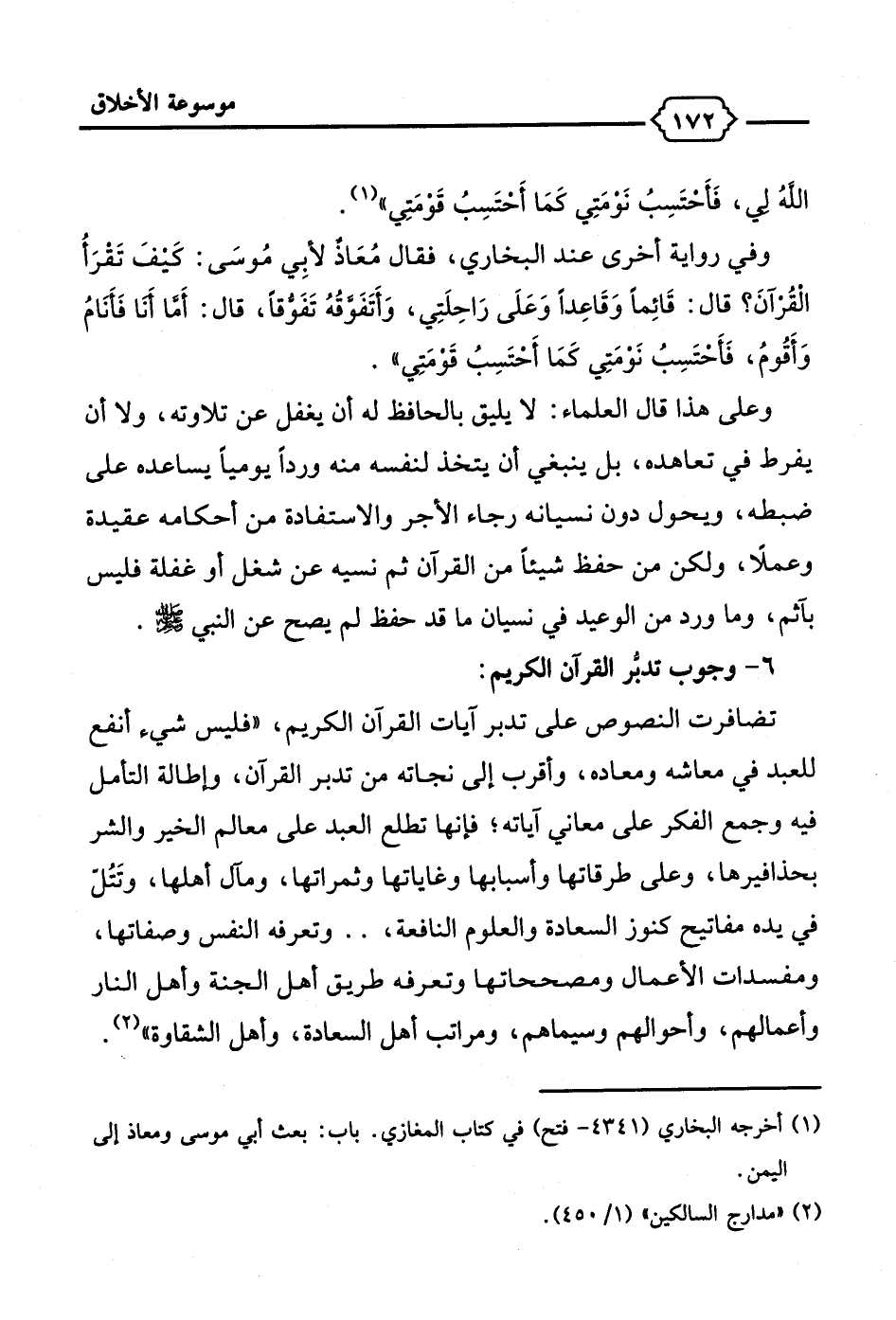 وفي رواية أخرى عند البخاري، فقال مُعَاذ لأبِي مُوسَى: كَيفَ تَقرَأُ القرآن؟ قال: قَائِمًا وَقَاعِدًا وَعَلَى رَاحِلَتِي، وَأَتَفَوَّقُهُ تَفَوقًا، قال: أَما أنا فَأنَامُ وَأَقُومُ، فَأحتسبُ نَومَتِي كَمَا أَحتَسِبُ قَومَتِي".