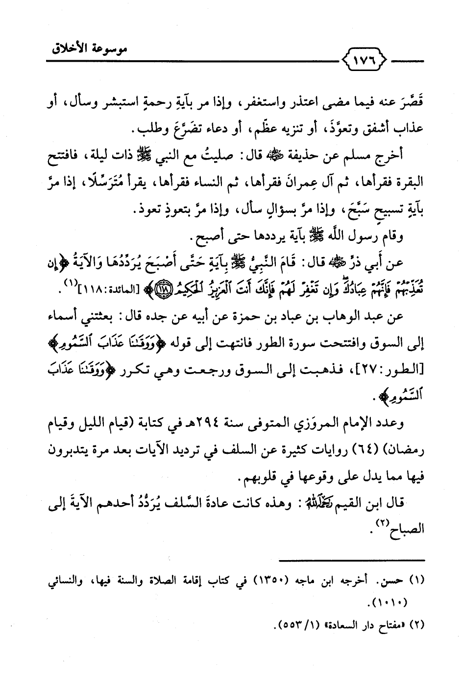 عن أَبي ذرٍّ - رضي الله عنه - قال: قَامَ النبِي - صلى الله عليه وسلم - بِآيَةِ حَتى أَصبَحَ يُرَدِّدُهَا وَالآيَةُ {إِنْ تُعَذِّبْهُمْ فَإِنَّهُمْ عِبَادُكَ وَإِنْ تَغْفِرْ لَهُمْ فَإِنَّكَ أَنْتَ الْعَزِيزُ الْحَكِيمُ (118)} [المائدة: 118] (¬1).