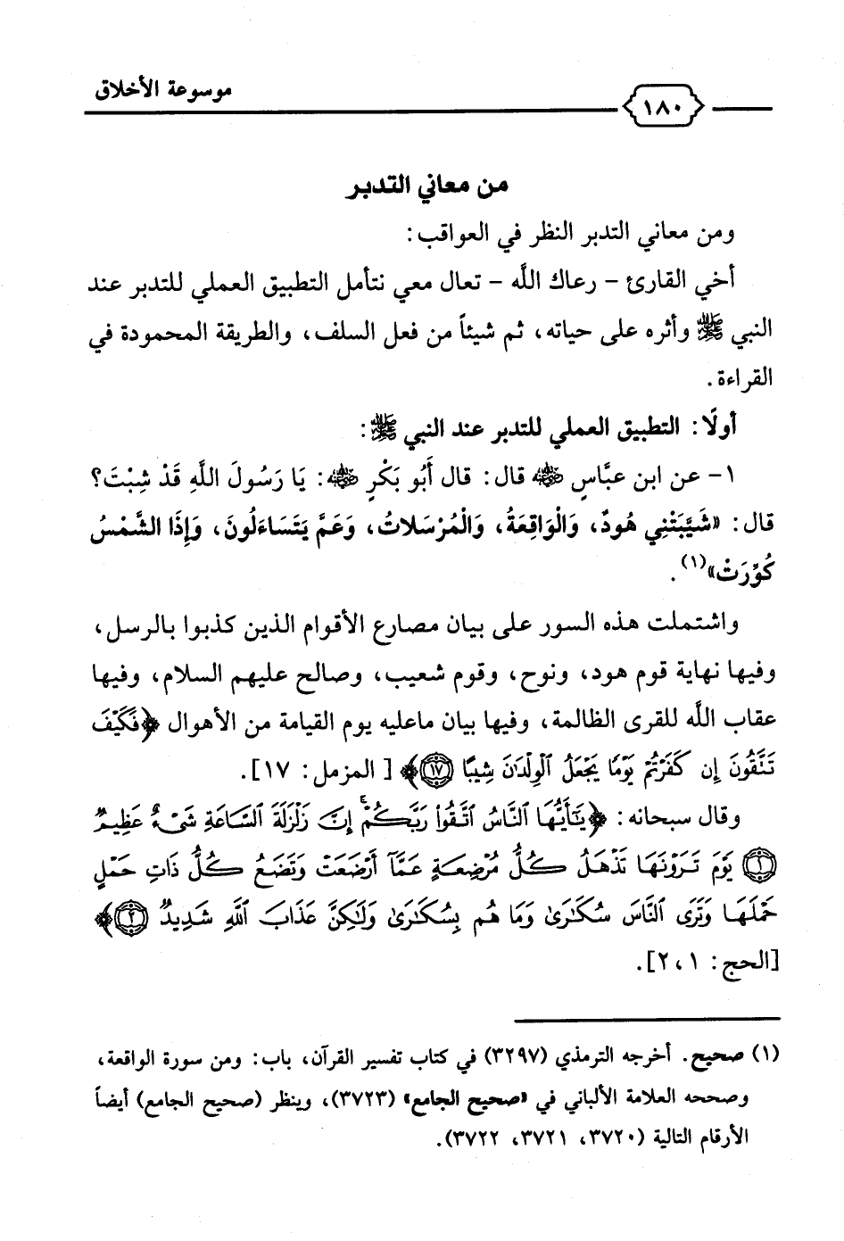 1 - عن ابن عبَّاسٍ - رضي الله عنه - قال: قال أَبُو بَكرٍ - رضي الله عنه -: يَا رَسُولَ اللهِ قَد شِبتَ؟ قال: "شَيَّبَتنِى هُودٌ، وَالوَاقِعَةُ، وَالمُرسَلاتُ، وَعَمَّ يَتَسَاءَلُونَ، وَإِذا الشمسُ كُورَت" (¬1).