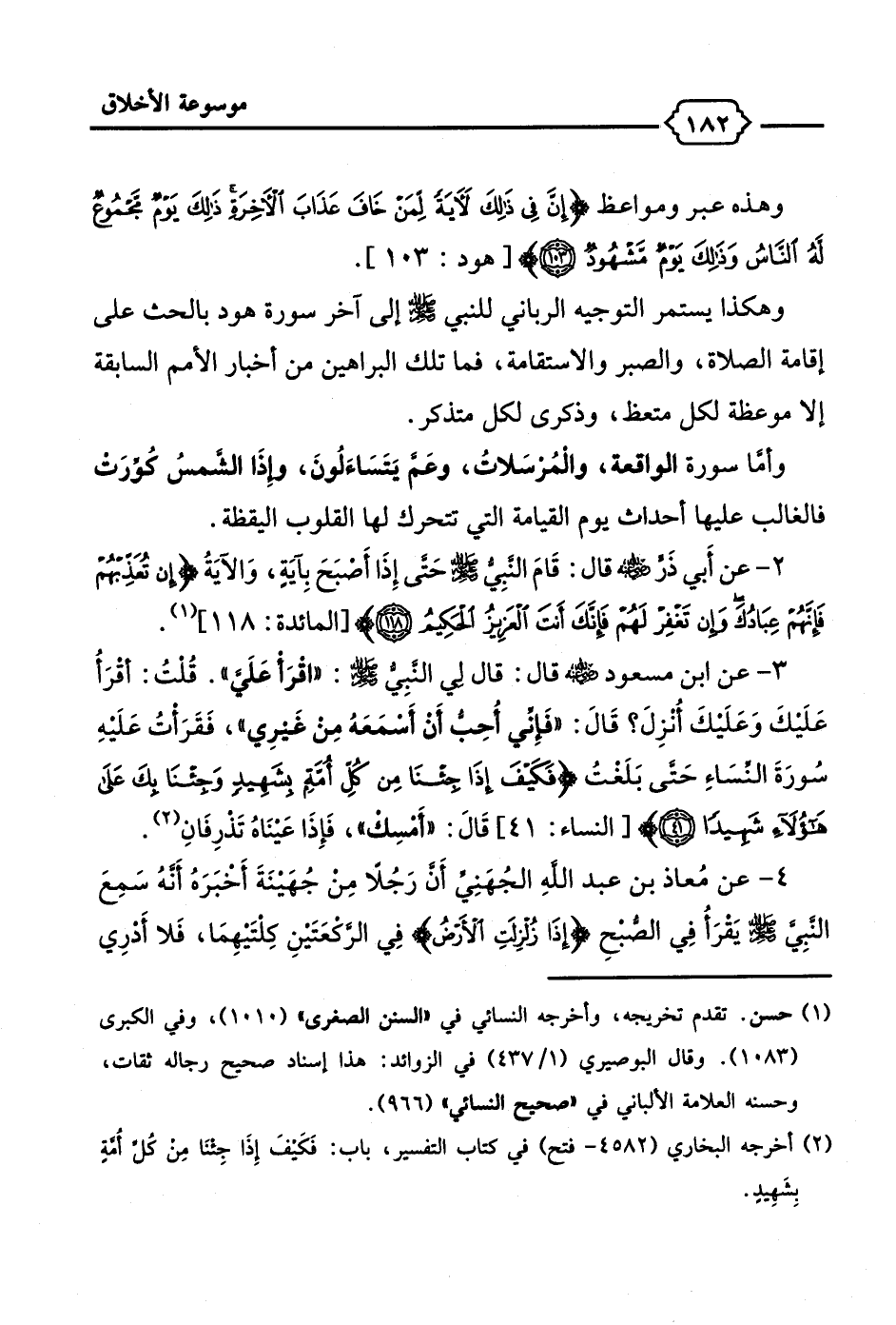 3 - عن ابن مسعود - رضي الله عنه - قال: قال لي النبِيّ - صلى الله عليه وسلم -: "اقرَأ عَلَيَّ". قُلتُ: أقرَأُ عَلَيكَ وَعَلَيكَ أُنزِلَ؟ قَالَ: "فَإني أُحِب أَن أَسمعَهُ من غيرِي"، فَقَرَأتُ عَلَيهِ سُورَةَ النسَاءِ حَتى بَلَغتُ {فَكَيْفَ إِذَا جِئْنَا مِنْ كُلِّ أُمَّةٍ بِشَهِيدٍ وَجِئْنَا بِكَ عَلَى هَؤُلَاءِ شَهِيدًا (41)} [النساء: 41] قَالَ: "أَمسِك" , فَإِذا عَينَاهُ تَذرِفَانِ (¬2).