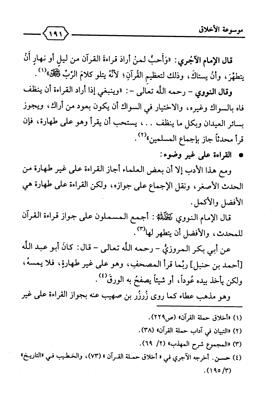 قال الإمام الآجُري: "وَأَحبُّ لمن أرادَ قراءةَ القرآن من ليلٍ أو نهارٍ أَنْ يتطهَّرَ، وأن يستاكَ، وذلك لتعظيمِ القُرآنِ؛ لأنهُ يتلو كلامَ الرَّب -عز وجل-" (¬1).