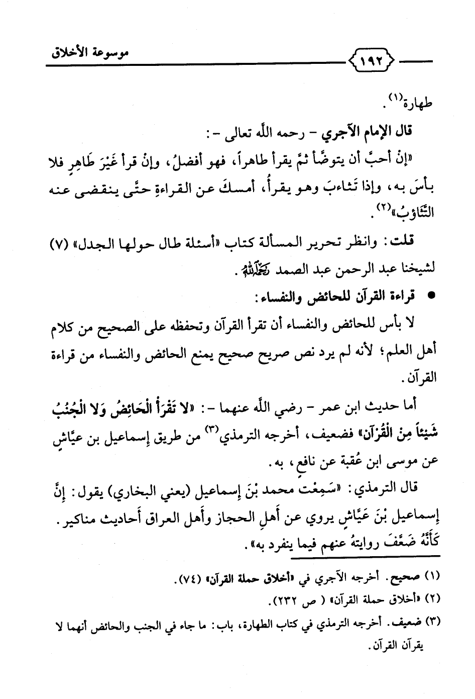 (¬3) ضعيف. أخرجه الترمذي في كتاب الطهارة، باب: ما جاء في الجنب والحائض أنهما لا يقرآن القرآن.