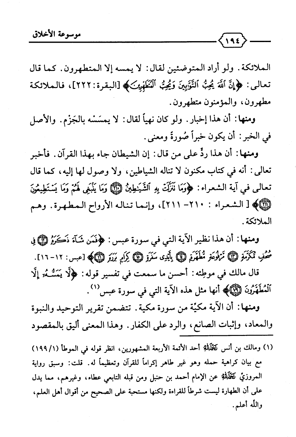 قال مالك في موطِئه: أحسن ما سمعت في تفسير قوله: {لَا يَمَسُّهُ إِلَّا الْمُطَهَّرُونَ} أنها مثل هذه الآية التي في سورة عبس (¬1).