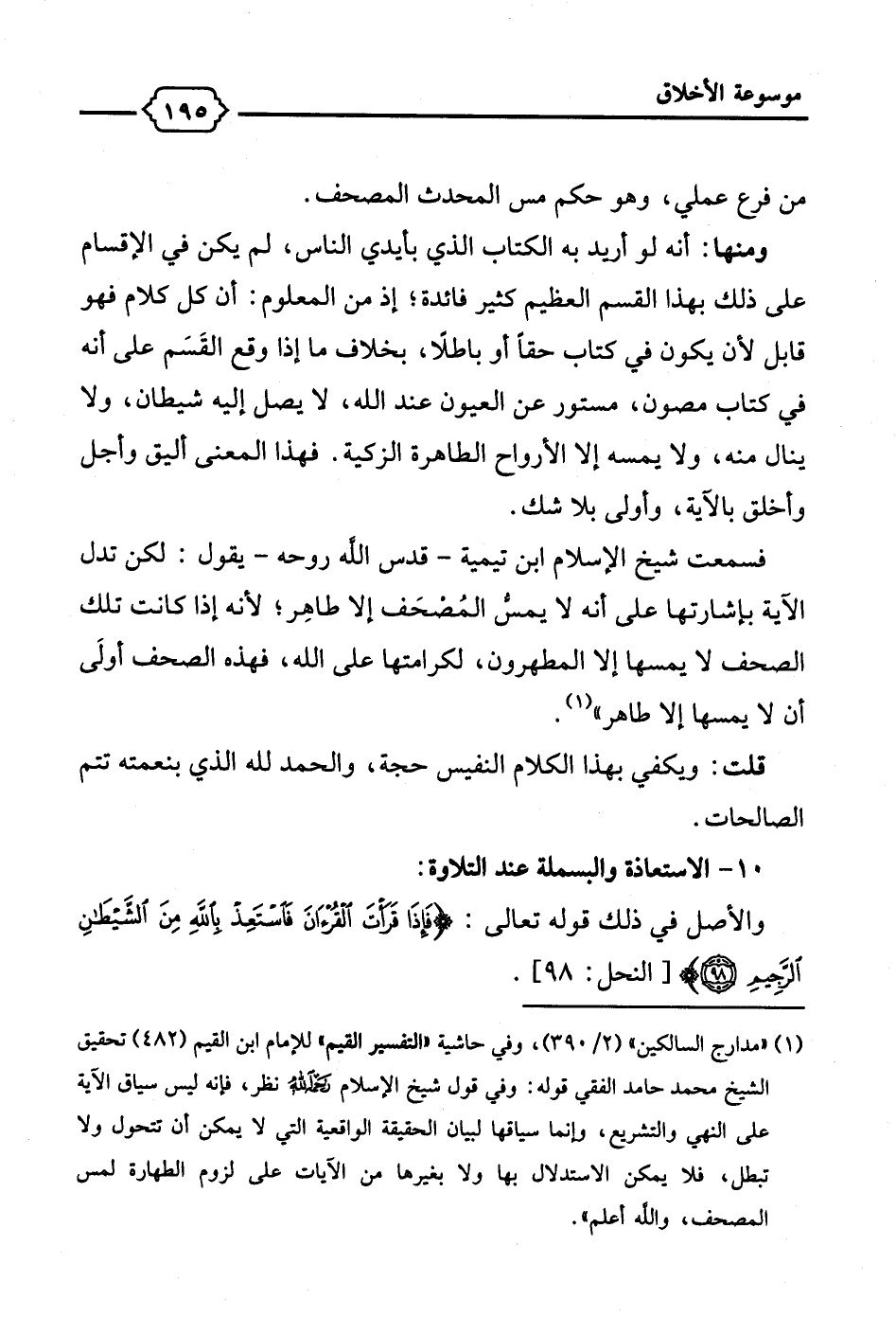 (¬1) "مدارج السالكين" (2/ 390)، وفي حاشية "التفسير القيم" للإمام ابن القيم (482) تحقيق الشيخ محمد حامد الفقي قوله: وفي قول شيخ الإسلام -رحمه الله- نظر، فإنه ليس سياق الآية على النهي والتشريع، وإنما سياقها لبيان الحقيقة الواقعية التي لا يمكن أن تتحول ولا تبطل، فلا يمكن الاستدلال بها ولا بغيرها من الآيات على لزوم الطهارة لمس المصحف، والله أعلم".