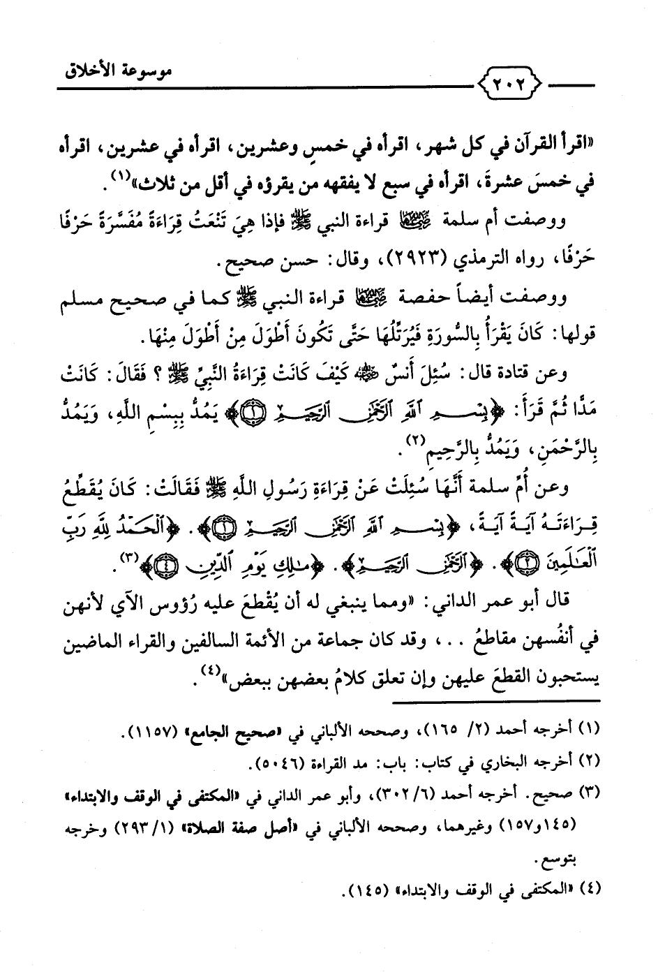 وعن أُمِّ سلمة أَنَّهَا سُئِلَت عَن قِرَاءَةِ رَسُولِ اللهِ - صلى الله عليه وسلم - فَقَالَت: كَانَ يُقَطَّعُ قِرَاءَتَهُ آيَةً آيَةً، {بِسْمِ اللَّهِ الرَّحْمَنِ الرَّحِيمِ (1)}. {الْحَمْدُ لِلَّهِ رَبِّ الْعَالَمِينَ (2)}. {الرَّحْمَنِ الرَّحِيمِ (3)}. {مَالِكِ يَوْمِ الدِّينِ (4)} (¬3).