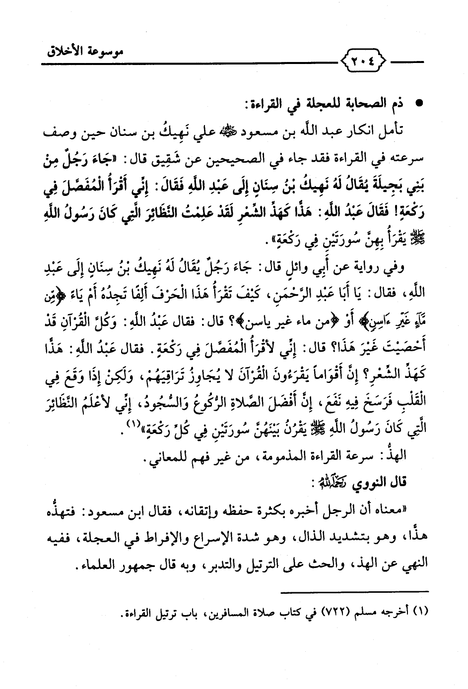 تأمل إنكار عبد الله بن مسعود - رضي الله عنه - علي نَهِيكُ بن سنان حين وصف سرعته في القراءة فقد جاء في الصحيحين عن شَقِيق قال: "جَاءَ رَجُلٌ من بَنِي بَجِيلَةَ يُقَالُ لَهُ نَهِيكُ بنُ سِنَانٍ إِلَى عَبدِ اللهِ فَقَالَ: "إِني أَقرَأُ المُفَضَّلَ فِي رَكعَةٍ! فَقَالَ عَبدُ اللهِ: هَذًّا كَهَذِّ الشِّعرِ لَقَد عَلِمتُ النَّظَائِرَ التِي كَانَ رَسُولُ اللهِ - صلى الله عليه وسلم - يَقرَأُ بِهِنَّ سُورَتَينِ فِي رَكعَةٍ".