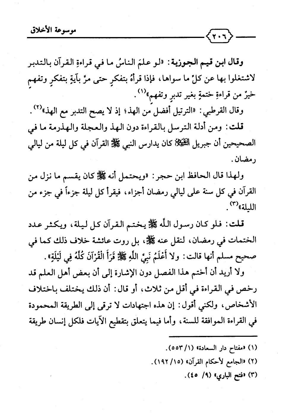 ولا أريد أن أختم هذا الفصل دون الإشارة إلى أن بعض أهل العلم قد رخص في القراءة في أقل من ثلاث، أو قال: أن ذلك يختلف باختلاف الأشخاص، ولكني أقول: إن هذه اجتهادات لا ترقى إلى الطريقة المحمودة في القراءة الموافقة للسنة، وأما فيما يتعلق بتقطيع الآيات فلكل إنسان طريقة