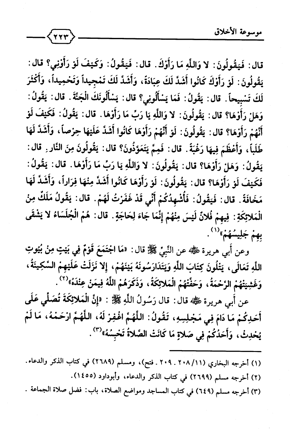 قال: فَيَقُولُونَ: لا وَاللهِ مَا رَأَوكَ. قال: فَيقُولُ: وَكَيفَ لَو رَأَونِي؟ قال: يَقُولُونَ: لَو رَأَوكَ كَانُوا أَشدَّ لَكَ عِبَادةً، وَأَشَدَّ لَكَ تَمجِيدًا وَتَحمِيدًا، وَأكَثَرَ لَكَ تَسبِيحًا. قال: يَقُولُ: فَمَا يَسألُوني؟ قال: يَسألُونَكَ الجَنةَ. قال: يَقُولُ: وَهَل رَأَوهَا؟ قال: يَقُولُونَ: لا وَاللهِ يَا رَبِّ مَا رَأَوهَا. قال: يَقُولُ: فَكَيفَ لَو أَنَّهُم رَأَوهَا؟ قال: يَقُولُونَ: لو أنهُم رَأَوهَا كَانُوا أَشَد عَلَيهَا حِرصاً، وَأَشَد لَهَا طَلَباً، وَأَعظَمَ فِيهَا رَغبَةً. قال: فَمِمَّ يَتَعَوذونَ؟ قال: يَقُولُونَ مِنَ النار. قال: يَقُولُ: وَهَل رَأَوهَا؟ قال: يَقُولُونَ: لا وَاللهِ يَا رَبِّ مَا رَأَوهَا. قال: يَقُولُ: فَكَيفَ لو رَأَوهَا؟ قال: يقُولُونَ: لو رَأَوهَا كَانُوا أَشَد مِنهَا فِرَاراً، وَأَشَد لَهَا مَخَافَةً. قال: فَيَقُولُ: فأشهِدُكم أَنِّي قَد غفَرتُ لَهُم. قال: يَقُولُ مَلَكٌ من المَلاِئكَةِ: فِيهِم فلُان لَيسَ مِنهُم إِنمَا جَاءَ لِحَاجَةٍ. قال: هُم الجُلَسَاءُ لا يَشقَى بِهِم جَلِيسُهُمْ" (¬1).