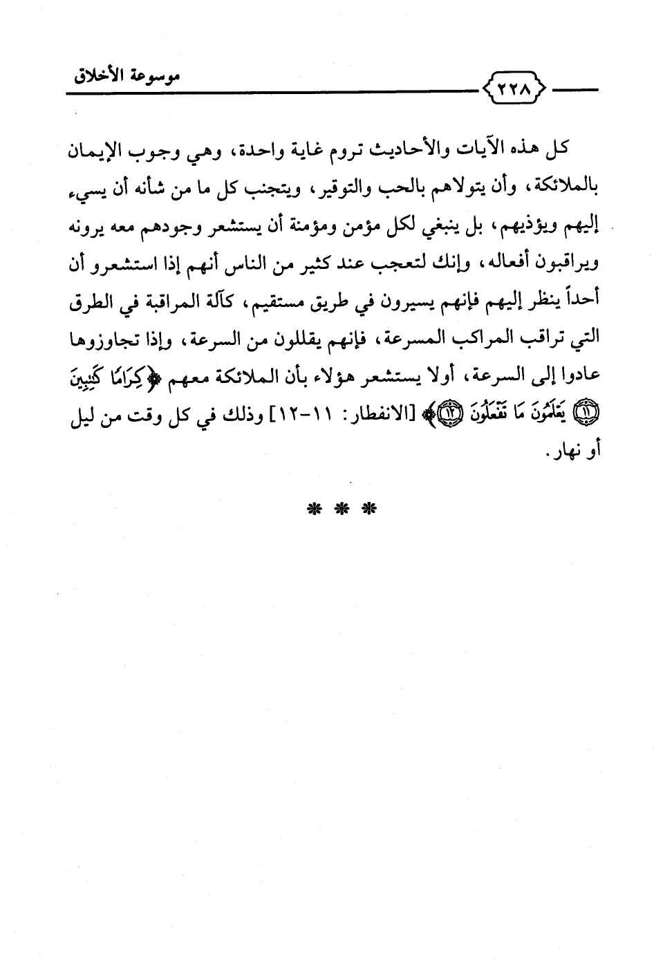 كل هذه الآيات والأحاديث تروم غاية واحدة، وهي وجوب الإيمان بالملائكة، وأن يتولاهم بالحب والتوقير، ويتجنب كل ما من شأنه أن يسيء إليهم ويؤذيهم، بل ينبغي لكل مؤمن ومؤمنة أن يستشعر وجودهم معه يرونه ويراقبون أفعاله، وإِنك لتعجب عند كثير من الناس أنهم إذا استشعروا أن أحدًا ينظر إليهم فإنهم يسيرون في طريق مستقيم، كآلة المراقبة في الطرق التي تراقب المراكب المسرعة، فإنهم يقللون من السرعة، وإذا تجاوزوها عادوا إلى السرعة، أولا يستشعر هؤلاء بأن الملائكة معهم {كِرَامًا كَاتِبِينَ (11) يَعْلَمُونَ مَا تَفْعَلُونَ (12)} [الانفطار11: 12] وذلك في كل وقت من ليل أو نهار.