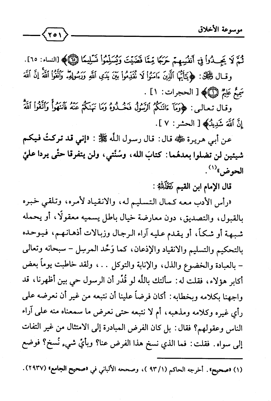 "رأس الأدب معه كمال التسليم له، والانقياد لأمره، وتلقي خبره بالقبول، والتصديق، دون معارضة خيال باطل يسميه معقولًا، أو يحمله شبهة أو شكاً، أو يقدم عليه آراء الرجال وزبالات أذهانهم، فيوحده بالتحكيم والتسليم والانقياد والإذعان، كما وَحَّد المرسِل -سبحانه وتعالى- بالعبادة والخضوع والذل، والإنابة والتوكل .. ، ولقد خاطبت يوماً بعض أكابر هؤلاء، فقلت له: سألتك بالله لو قُدر أن الرسول حي بين أظهرنا، قد واجهنا بكلامه وبخطابه: أكان فرضاً علينا أن نتبعه من غير أن نعرضه على رأي غيره وكلامه ومذهبه، أم لا نتبعه حتى نعرض ما سمعناه منه على آراء الناس وعقولهم؟ فقال: بل كان الفرض المبادرة إلى الامتثال من غير التفات إلى سواه. فقلت: فما الذي نسخ هذا الفرض عنا؟ وبأيِّ شيء نُسخ؟ فوضع