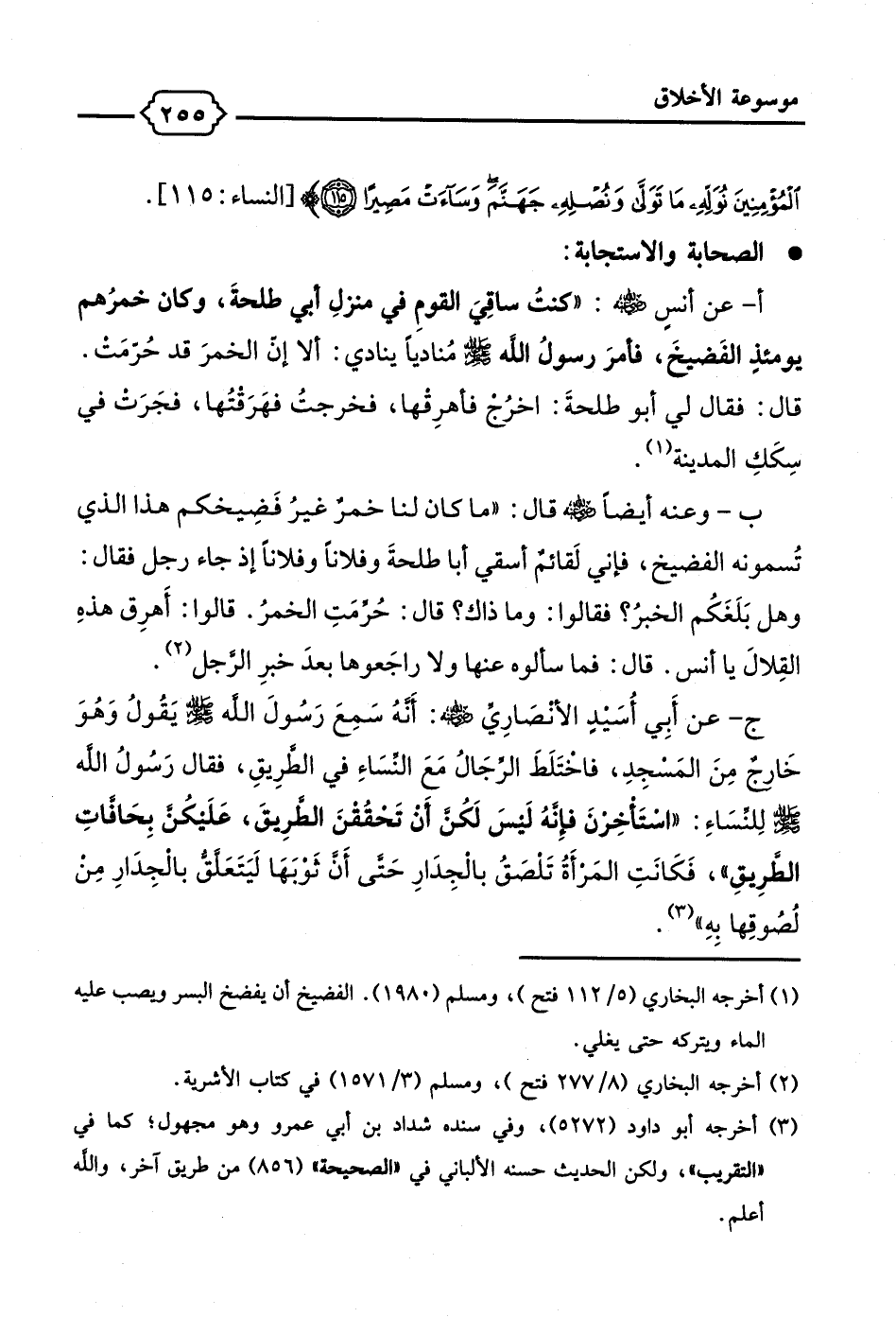 أ- عن أنسٍ - رضي الله عنه -: "كنتُ ساقيَ القومِ في منزلِ أبي طلحةَ، وكان خمرُهم يومئذٍ الفَضيخَ، فأمرَ رسولُ الله - صلى الله عليه وسلم - مُنادياً ينادي: ألا إن الخمرَ قد حُرّمَت. قال: فقال لي أبو طلحةَ: اخرُج فأهرِقها، فخرجتُ فهَرَقتُها، فجَرَت في سِكَكِ المدينة (¬1).