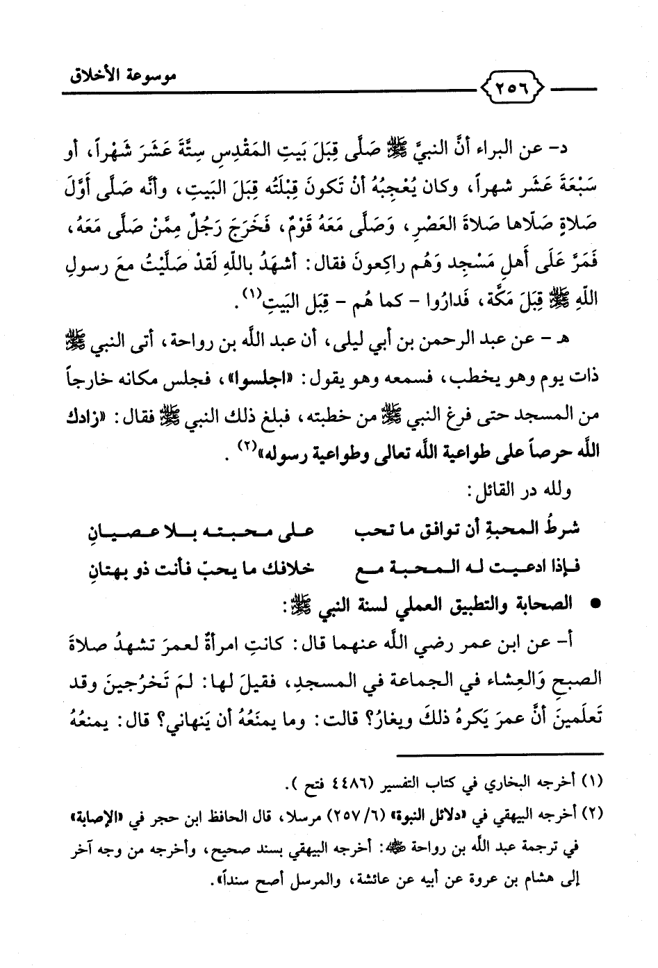 د- عن البراء أنَّ النبي - صلى الله عليه وسلم - صَلى قِبَلَ بَيتِ المَقدِسِ سِتةَ عَشَرَ شَهرًا، أو سَبعَةَ عَشَر شهرًا، وكان يُعجِبُهُ أن تَكونَ قِبلَتُه قِبَلَ البَيتِ، وأنه صَلى أَولَ صَلاةِ صَلاها صَلاةَ العَصرِ، وَصَلى مَعَهُ قَومٌ، فَخَرَجَ رَجُلْ مِمن صَلى مَعَهُ، فَمَر عَلَى أَهلِ مَسجِد وَهُم راكِعونَ فقال: أشهَدُ باللهِ لَقد صَليتُ معَ رسولِ اللهِ - صلى الله عليه وسلم - قِبَلَ مَكة، فَدارُوا -كما هُم- قِبَل البَيتِ (¬1).