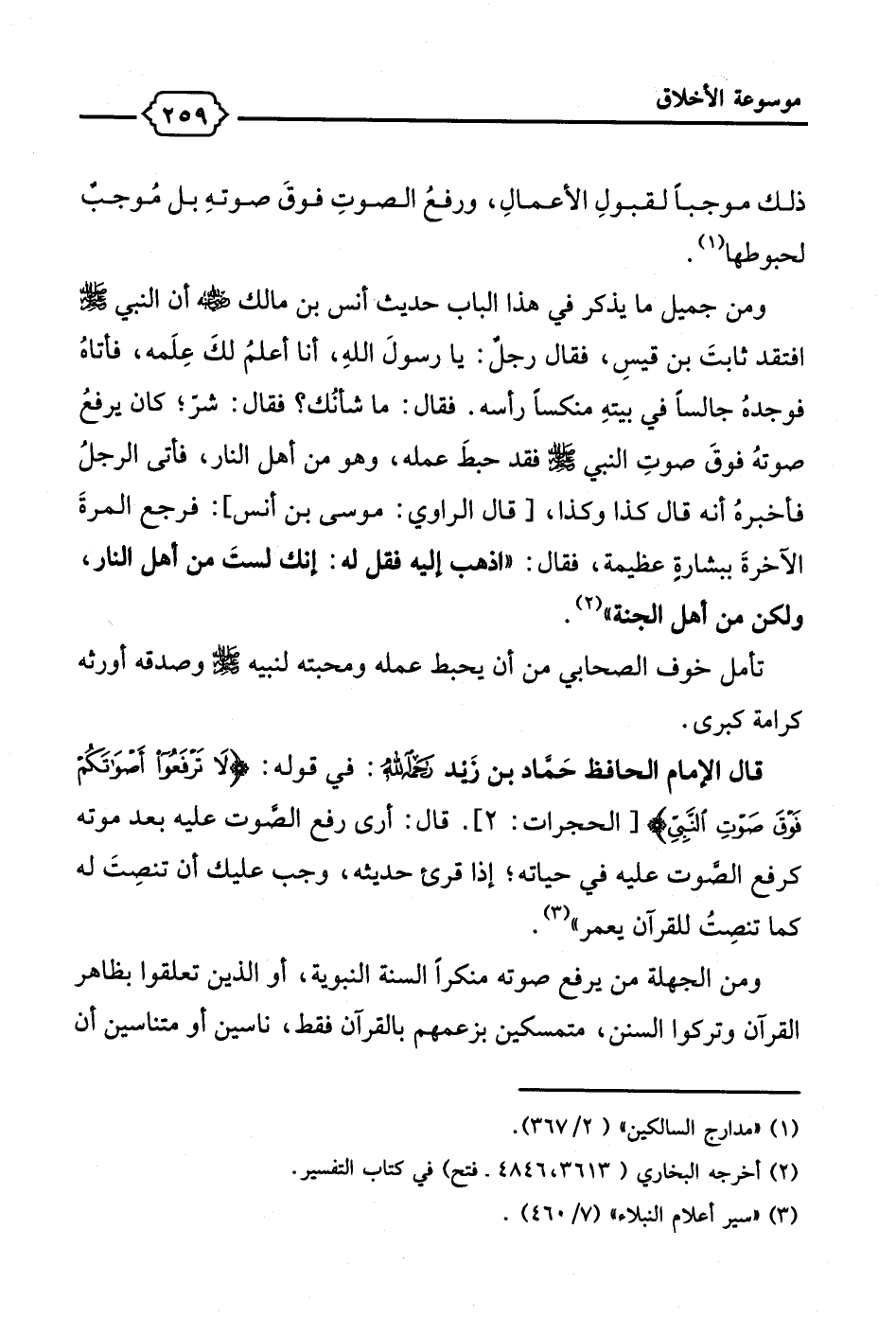 قال الإمام الحافظ حَماد بن زَيد - رضي الله عنه -: في قوله: {لَا تَرْفَعُوا أَصْوَاتَكُمْ فَوْقَ صَوْتِ النَّبِيِّ} [الحجرات: 2]. قال: أرى رفع الصَّوت عليه بعد موته كرفع الصَّوت عليه في حياته؛ إذا قرئ حديثه، وجب عليك أن تنصِتَ له كما تنصِتُ للقرآن يعمر" (¬3).