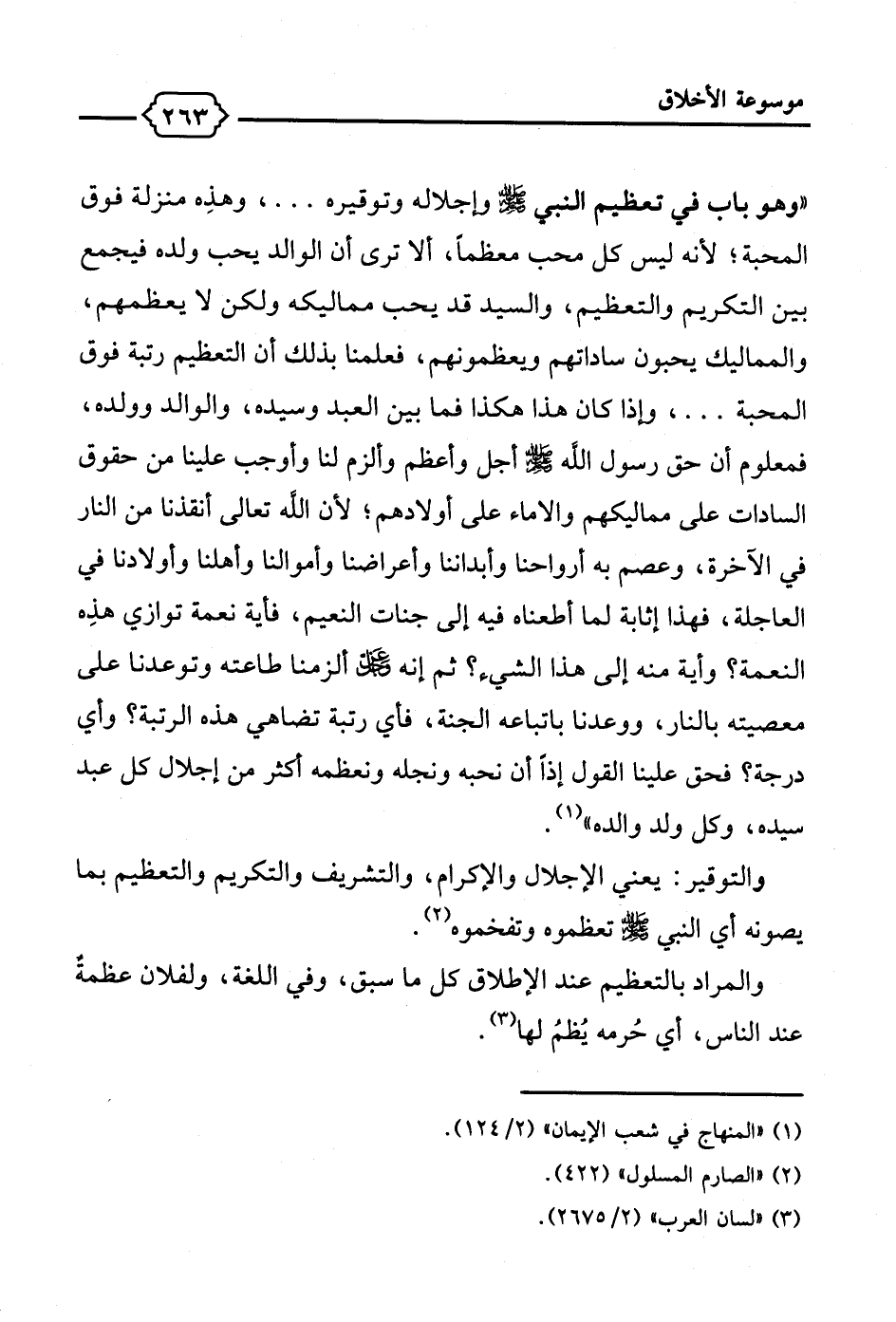 "وهو باب في تعظيم النبي - صلى الله عليه وسلم - وإجلاله وتوقيره ... ، وهذِه منزلة فوق المحبة؛ لأنه ليس كل محب معظمًا، ألا ترى أن الوالد يحب ولده فيجمع بين التكريم والتعظيم، والسيد قد يحب مماليكه ولكن لا يعظمهم، والمماليك يحبون ساداتهم ويعظمونهم، فعلمنا بذلك أن التعظيم رتبة فوق المحبة ... ، وإذا كان هذا هكذا فما بين العبد وسيده، والوالد وولده، فمعلوم أن حق رسول الله - صلى الله عليه وسلم - أجل وأعظم وألزم لنا وأوجب علينا من حقوق السادات على مماليكهم والإماء على أولادهم؛ لأن الله تعالى أنقذنا من النار في الآخرة، وعصم به أرواحنا وأبداننا وأعراضنا وأموالنا وأهلنا وأولادنا في العاجلة، فهذا إثابة لما أطعناه فيه إلى جنات النعيم، فأية نعمة توازي هذِه النعمة؟ وأية منه إلى هذا الشيء؟ ثم إنه -عز وجل- ألزمنا طاعته وتوعدنا على معصيته بالنار، ووعدنا باتباعه الجنة، فأي رتبة تضاهي هذه الرتبة؟ وأي درجة؟ فحق علينا القول إذًا أن نحبه ونجله ونعظمه أكثر من إجلال كل عبد سيده، وكل ولد والده" (¬1).
