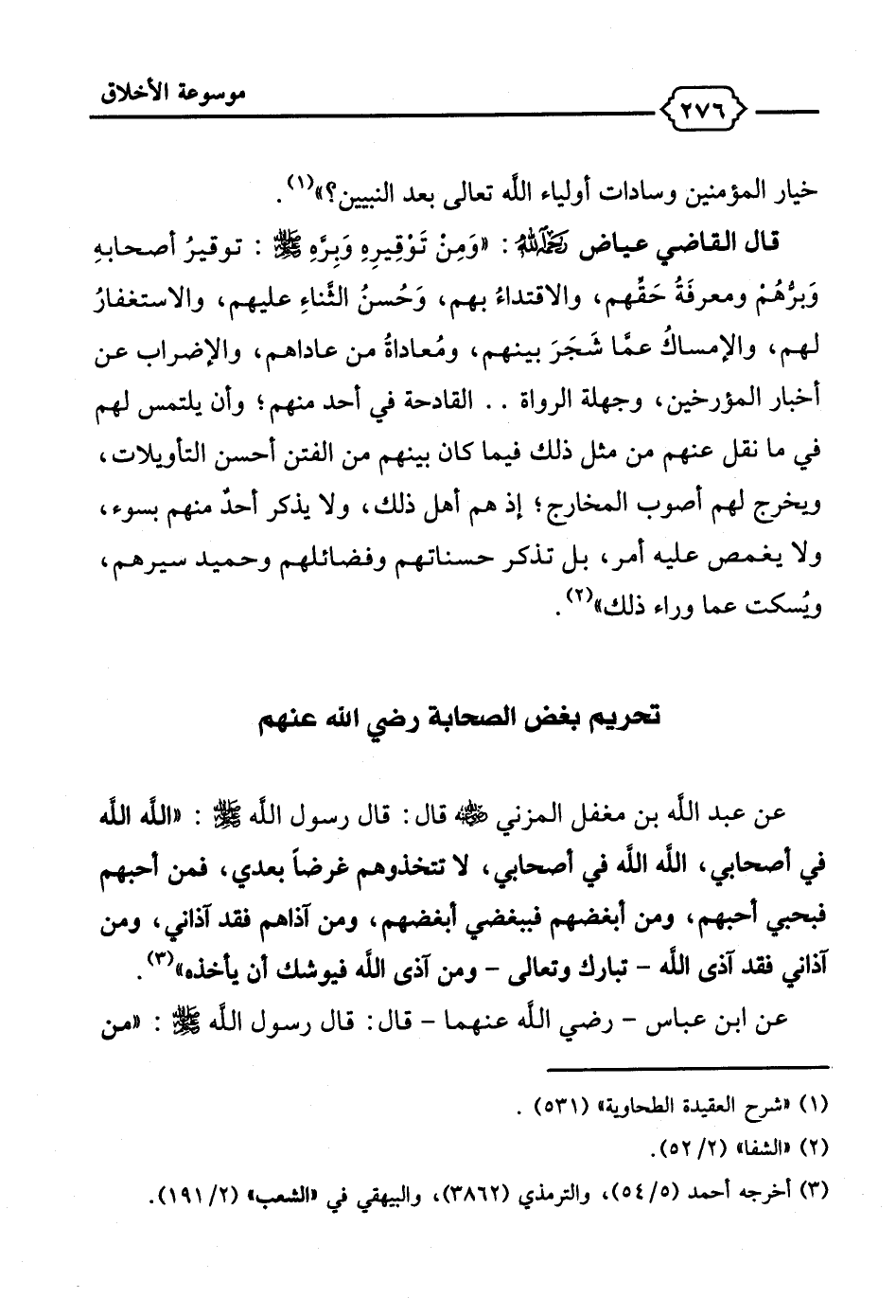 قال القاضي عياض -رحمه الله-: "وَمِن تَوقِيرِهِ وَبِرَّهِ - صلى الله عليه وسلم -: توقيرُ أصحابهِ وَبرهُم ومعرفَةُ حَقِّهم، والاقتداءُ بهم، وَحُسنُ الثناءِ عليهم، والاستغفارُ لهم، والإمساكُ عما شَجَرَ بينهم، ومُعاداةُ من عاداهم، والإضراب عن أخبار المؤرخين، وجهلة الرواة .. القادحة في أحد منهم؛ وأن يلتمس لهم في ما نقل عنهم من مثل ذلك فيما كان بينهم من الفتن أحسن التأويلات، ويخرج لهم أصوب المخارج؛ إذ هم أهل ذلك، ولا يذكر أحد منهم بسوء، ولا يغمص عليه أمر، بل تذكر حسناتهم وفضائلهم وحميد سيرهم، وُيسكت عما وراء ذلك" (¬2).