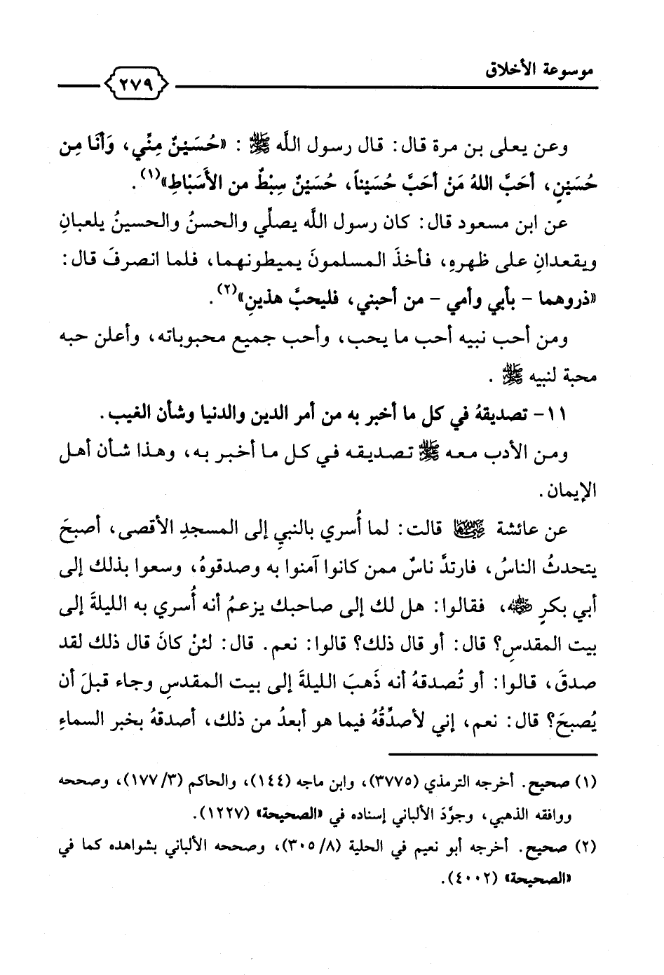 عن ابن مسعود قال: كان رسول الله يصلِّي والحسنُ والحسينُ يلعبانِ ويقعدانِ على ظهرهِ، فأخذَ المسلمونَ يميطونهما، فلما انصرفَ قال: "ذروهما -بأبي وأمي- من أحبني، فليحبَّ هذينِ" (¬2).