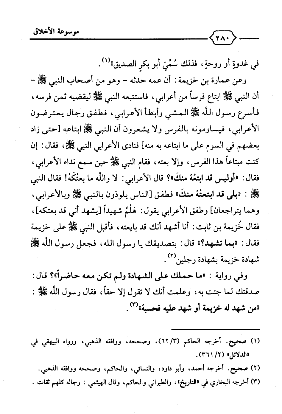 وعن عمارة بن خزيمة: أن عمه حدثه -وهو من أصحاب النبي - صلى الله عليه وسلم - أن النبي - صلى الله عليه وسلم - ابتاع فرساً من أعرابي، فاستتبعه النبي - صلى الله عليه وسلم - ليقضيه ثمن فرسه، فأسرع رسول الله - صلى الله عليه وسلم - المشي وأبطأ الأعرابي، فطفق رجال يعترضون الأعرابي، فيساومونه بالفرس ولا يشعرون أن النبي - صلى الله عليه وسلم - ابتاعه [حتى زاد بعضهم في السوم على ما ابتاعه به منه]، فنادى الأعرابي النبي - صلى الله عليه وسلم -، فقال: إن كنت مبتاعًا هذا الفرس، وإلا بعته، فقام النبي - صلى الله عليه وسلم - حين سمع نداء الأعرابي، فقال: "أوليس قد ابتعُهُ منكَ"؟ قال الأعرابي: لا والله ما بعتُكَهُ! فقال النبي - صلى الله عليه وسلم -: "بلى قد ابتعتُهُ منكَ" فطفق [الناس يلوذون بالنبي - صلى الله عليه وسلم - وبالأعرابي، وهما يتراجعان] وطفق الأعرابي يقول: هَلُم شهيداً [يشهد أني قد بعتكه]، فقال خُزيمة بن ثابت: أنا أشهد أنك قد بايعته، فأقبل النبي - صلى الله عليه وسلم - على خزيمة فقال: "بما تشهد؟ " قال: بتصديقك يا رسول الله، فجعل رسول الله - صلى الله عليه وسلم - شهادة خزيمة بشهادة رجلين (¬2).