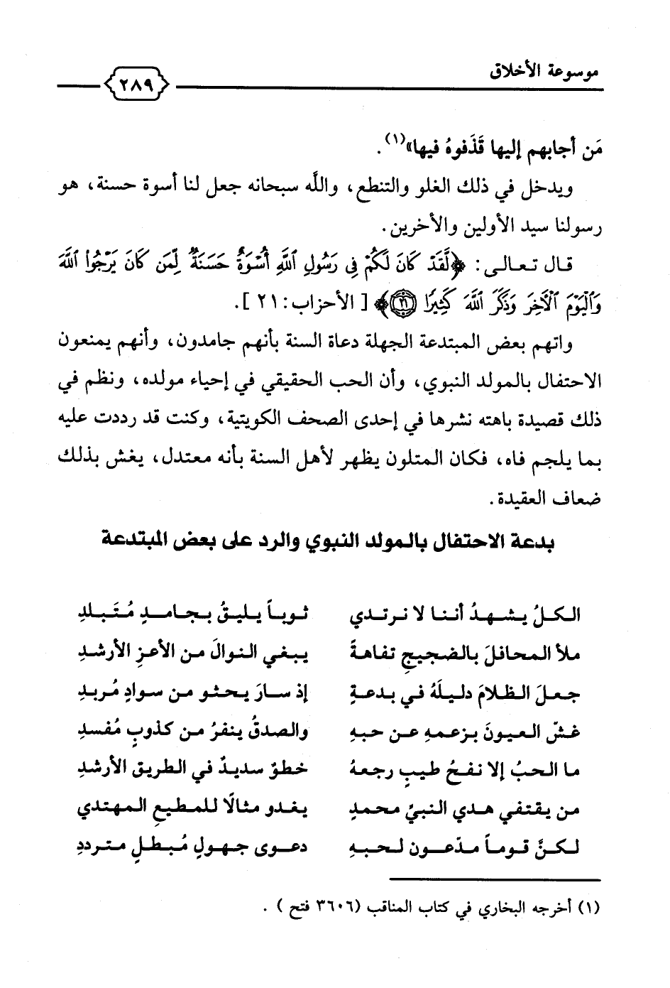 واتهم بعض المبتدعة الجهلة دعاة السنة بأنهم جامدون، وأنهم يمنعون الاحتفال بالمولد النبوي، وأن الحب الحقيقي في إحياء مولده، ونظم في ذلك قصيدة باهته نشرها في إحدى الصحف الكويتية، وكنت قد رددت عليه بما يلجم فاه، فكان المتلون يظهر لأهل السنة بأنه معتدل، يغش بذلك ضعاف العقيدة.