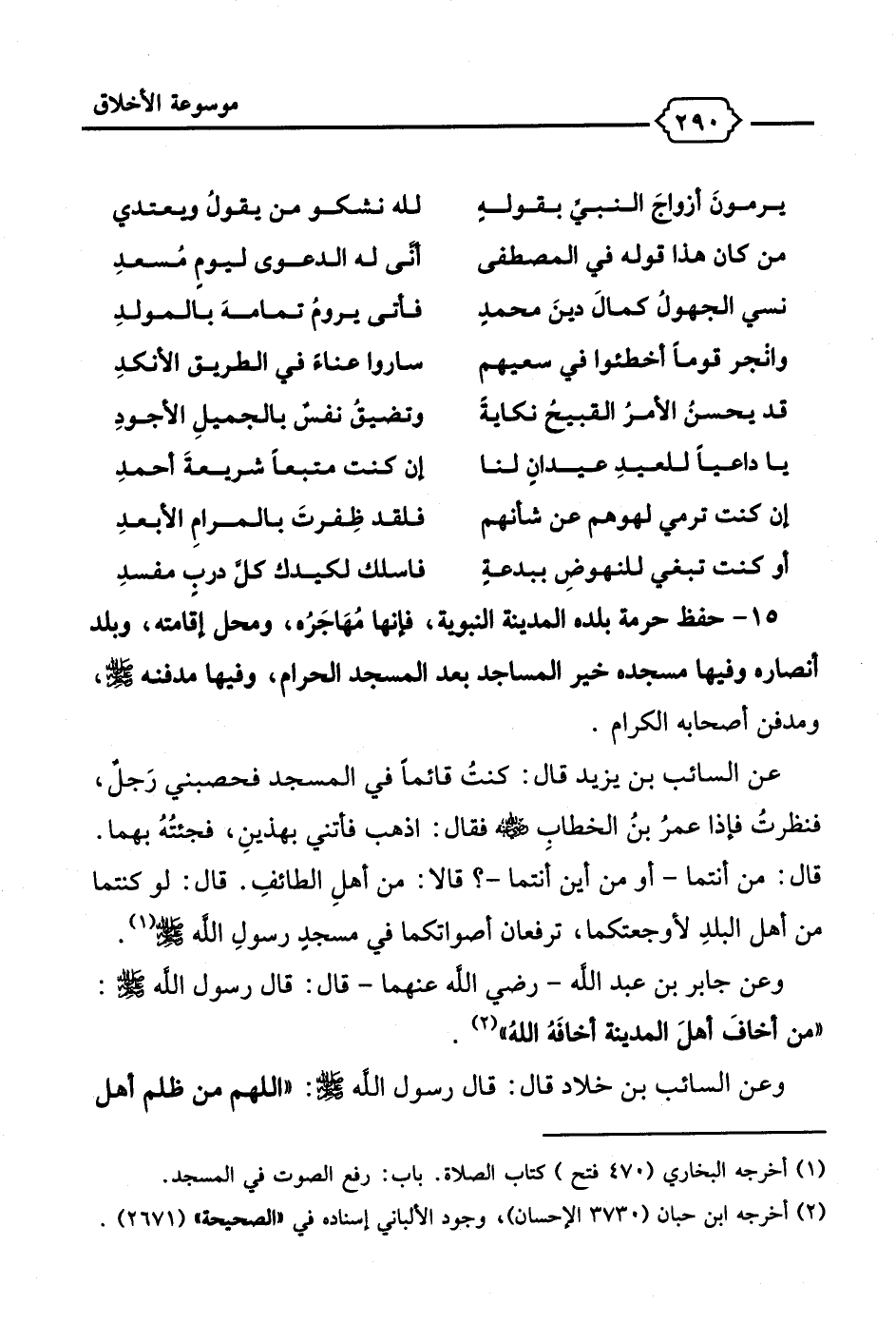 15 - حفظ حرمة بلده المدينة النبوية، فإنها مُهَاجَرُه، ومحل إقامته، وبلد أنصاره وفيها مسجده خير المساجد بعد المسجد الحرام، وفيها مدفنه - صلى الله عليه وسلم -، ومدفن أصحابه الكرام.