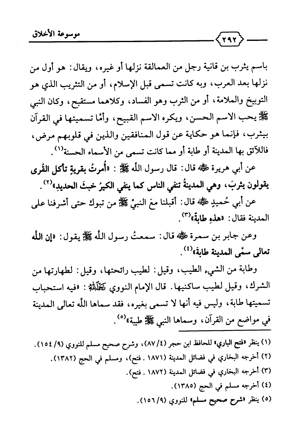 وعن جابر بن سمرة - رضي الله عنه - قال: سمعتُ رسول الله - صلى الله عليه وسلم - يقول: "إن الله تعالى سمى المدينة طابة" (¬4).