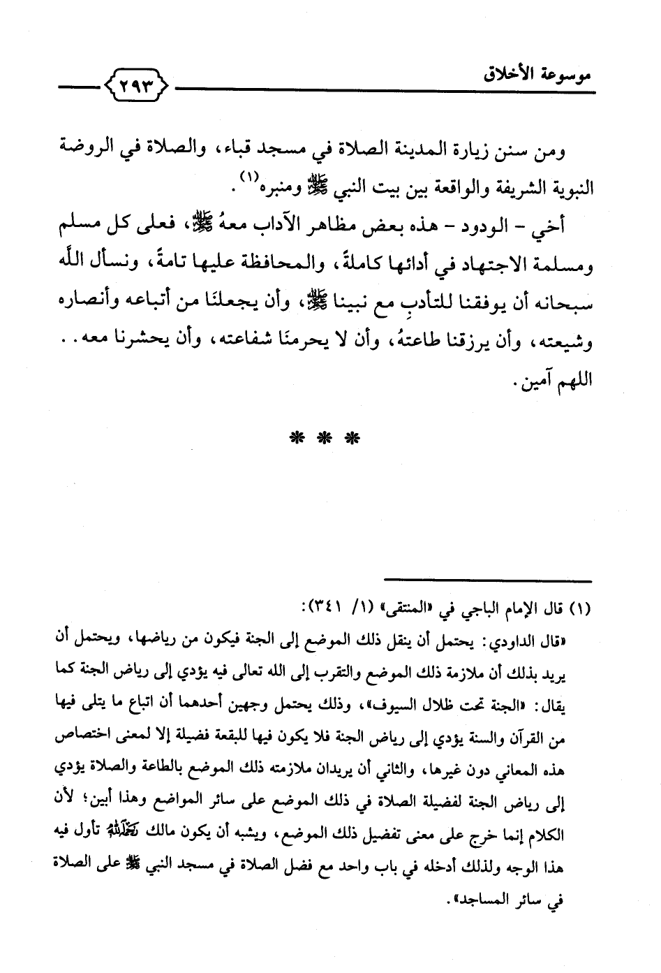 ومن سنن زيارة المدينة الصلاة في مسجد قباء، والصلاة في الروضة النبوية الشريفة والواقعة بين بيت النبي - صلى الله عليه وسلم - ومنبره (¬1).