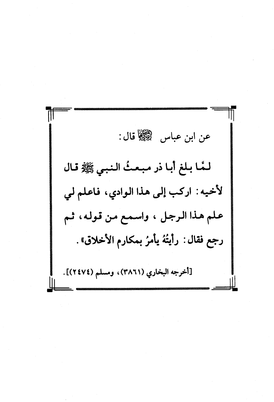 لمَّا بلغ أبا ذر مبعثُ النبي - صلى الله عليه وسلم - قال لأخيه: اركب إلى هذا الوادي، فاعلم لي علم هذا الرجل، واسمع من قوله، ثم رجع فقال: رأيتُهُ يأمرُ بمكارم الأخلاق".