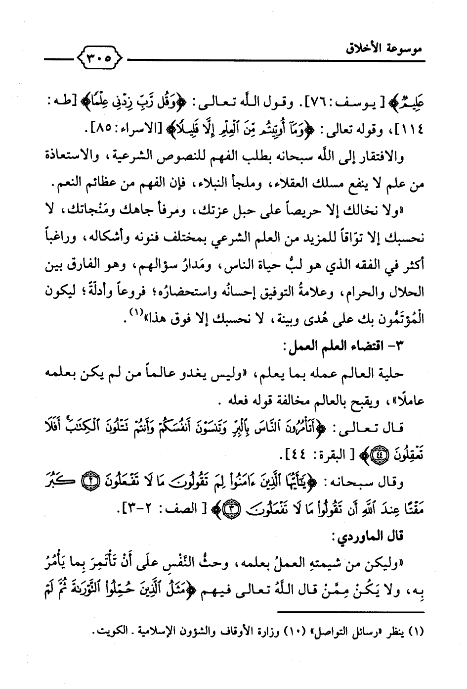 "وليكن من شيمتهِ العملُ بعلمه، وحثُّ النفسِ علَى أن تَأتَمِرَ بِما يَأمُرُ بِه، ولا يَكُن مِمن قال اللهُ تعالى فيهم {مَثَلُ الَّذِينَ حُمِّلُوا التَّوْرَاةَ ثُمَّ لَمْ
