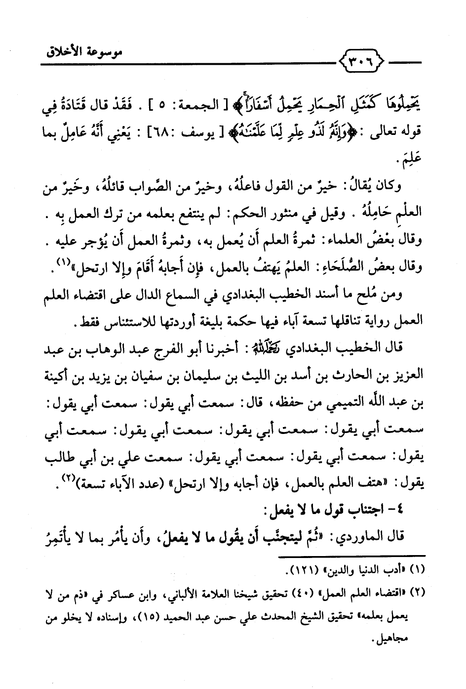 يَحْمِلُوهَا كَمَثَلِ الْحِمَارِ يَحْمِلُ أَسْفَارًا} [الجمعة: 5]. فَقَد قال قَتَادةُ فِي قوله تعالى: {وَإنَّهُ لَذُو عِلْمٍ لِمَا عَلَّمْنَاهُ} [يوسف: 68]: يَعنِي أَنهُ عَامِل بما عَلِمَ.