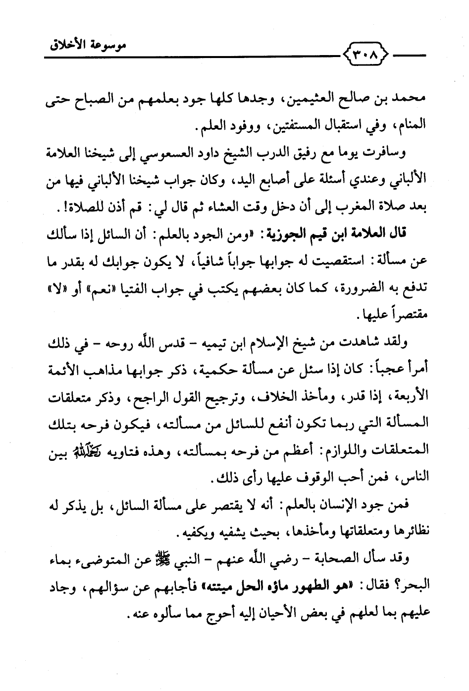 وقد سأل الصحابة -رضي الله عنهم- النبي - صلى الله عليه وسلم - عن المتوضئ بماء البحر؟ فقال: "هو الطهور ماؤه الحل ميتته" فأجابهم عن سؤالهم، وجاد عليهم بما لعلهم في بعض الأحيان إليه أحوج مما سألوه عنه.