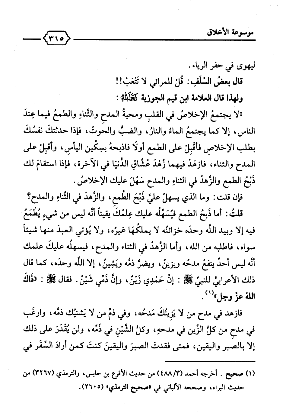 "لا يجتمعُ الإخلاصُ في القلبِ ومحبةُ المدحِ والثناءِ والطمعُ فيما عِندَ الناس، إلا كما يجتمعُ الماءُ والنارُ، والضب والحوتُ، فإذا حدثتكَ نفسُكَ بطلب الإخلاصِ فأقبِل على الطمع أولًا فاذبحهُ بسِكين اليأسِ، وأقبِل على المدح والثناء، فازهَدْ فيهما زُهدَ عُشاقِ الدنيَا في الآخرة، فإذا استقامَ لك ذَبحُ الطمع والزهدُ في الثناءِ والمدح سَهُلَ عليك الأخلاصُ.
