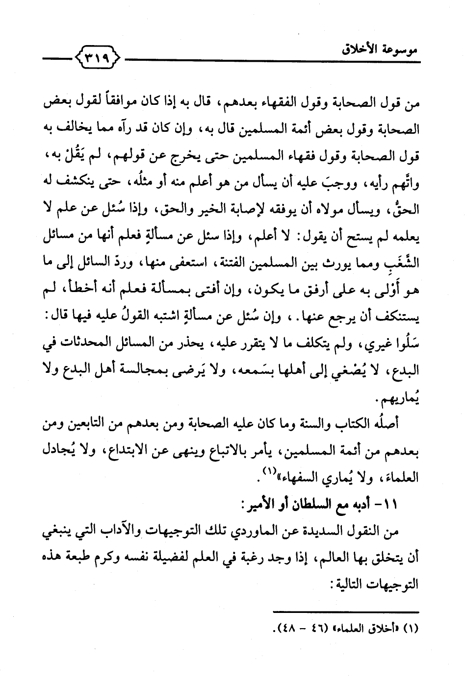 من النقول السديدة عن الماوردي تلك التوجيهات والآداب التي ينبغي أن يتخلق بها العالم، إذا وجد رغبة في العلم لفضيلة نفسه وكرم طبعة هذه التوجيهات التالية: