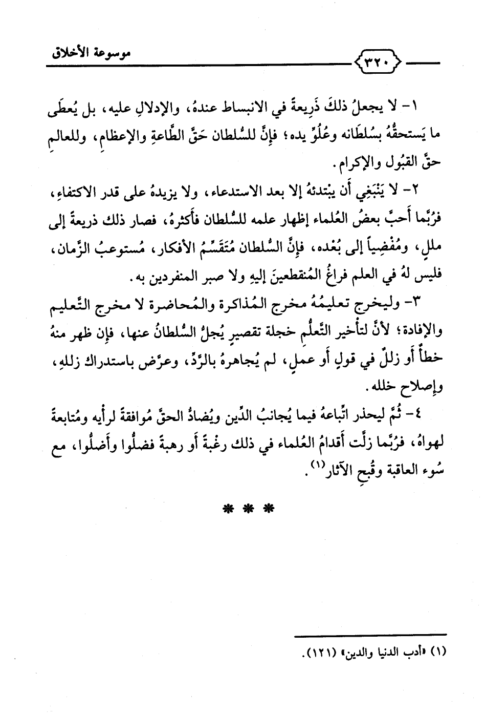 2 - لا يَنبَغِي أَن يبتدئهُ إلا بعد الاستدعاء، ولا يزيدهُ على قدر الاكتفاءِ, فرُبما أَحبَّ بعضُ العُلماء إظهار علمه للسُّلطان فأكَثرهُ، فصار ذلك ذريعةً إلى مللٍ، ومُفضِيًا إلى بُعده، فإِن السلطان مُتَقَسّمُ الأفكار، مُستوعبُ الزمان، فليس لهُ في العلم فراغ المُنقطعينَ إليهِ ولا صبر المنفردين به.