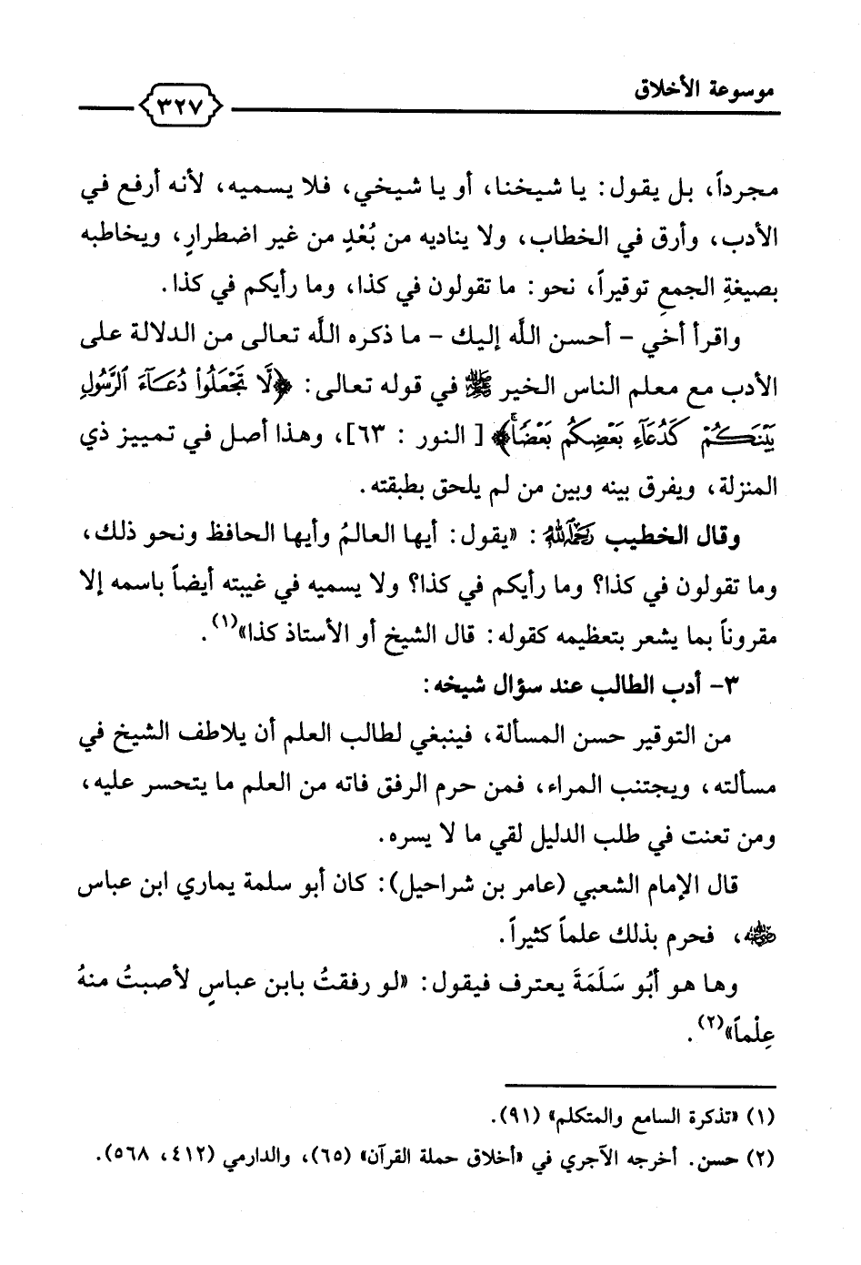 واقرأ أخي -أحسن الله إليك- ما ذكره الله تعالى من الدلالة على الأدب مع معلم الناس الخير - صلى الله عليه وسلم - في قوله تعالى: {لَا تَجْعَلُوا دُعَاءَ الرَّسُولِ بَيْنَكُمْ كَدُعَاءِ بَعْضِكُمْ بَعْضًا} [النور: 63]، وهذا أصل في تمييز ذي المنزلة، ويفرق بينه وبين من لم يلحق بطبقته.