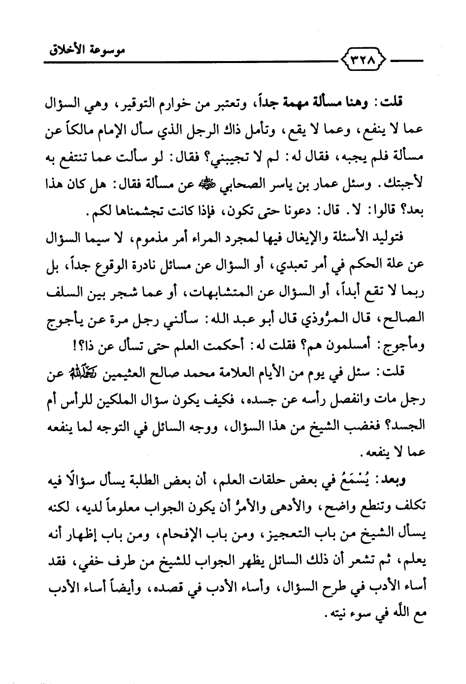 قلت: وهنا مسألة مهمة جداً، وتعتبر من خوارم التوقير، وهي السؤال عما لا ينفع، وعما لا يقع، وتأمل ذاك الرجل الذي سأل الإمام مالكًا عن مسألة فلم يجبه، فقال له: لم لا تجيبني؟ فقال: لو سألت عما تنتفع به لأجبتك. وسئل عمار بن ياسر الصحابي - رضي الله عنه - عن مسألة فقال: هل كان هذا بعد؟ قالوا: لا. قال: دعونا حتى تكون، فإذا كانت تجشمناها لكم.
