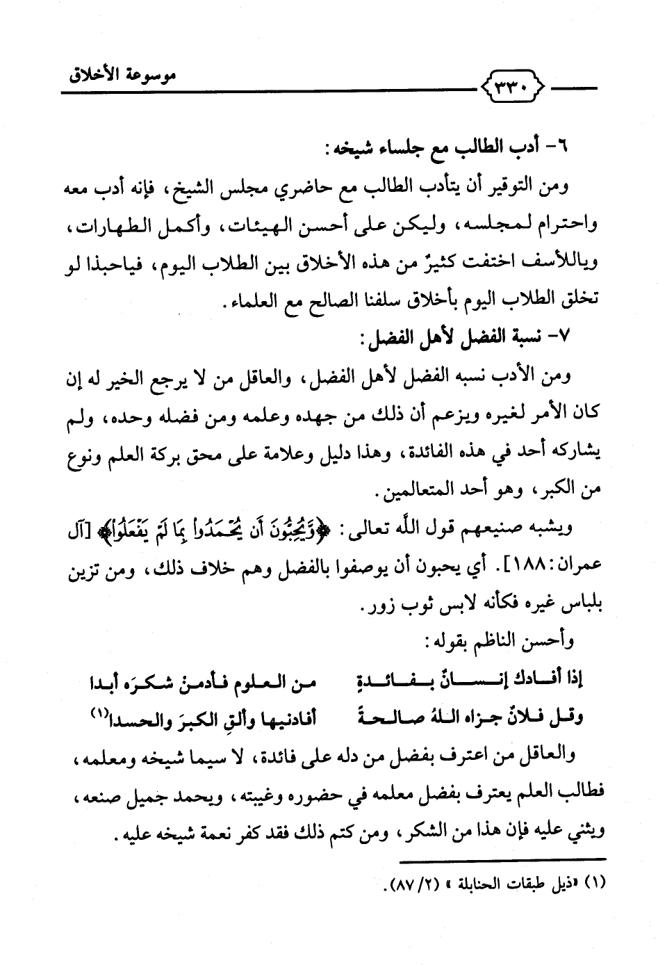 ومن الأدب نسبه الفضل لأهل الفضل، والعاقل من لا يرجع الخير له إن كان الأمر لغيره ويزعم أن ذلك من جهده وعلمه ومن فضله وحده، ولم يشاركه أحد في هذه الفائدة، وهذا دليل وعلامة على محق بركة العلم ونوع من الكبر، وهو أحد المتعالمين.