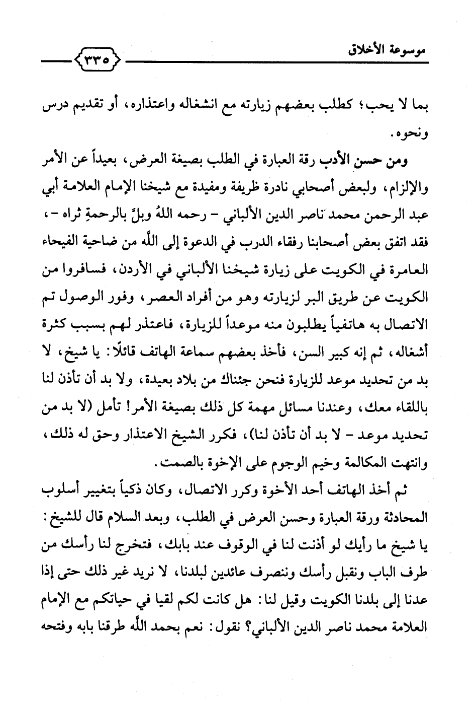 ومن حسن الأدب رقة العبارة في الطلب بصيغة العرض، بعيدًا عن الأمر والإلزام، ولبعض أصحابي نادرة ظريفة ومفيدة مع شيخنا الإمام العلامة أبي عبد الرحمن محمد ناصر الدين الألباني -رحمه اللهُ وبلَّ بالرحمةِ ثراه-، فقد اتفق بعض أصحابنا رفقاء الدرب في الدعوة إلى الله من ضاحية الفيحاء العامرة في الكويت على زيارة شيخنا الألباني في الأردن، فسافروا من الكويت عن طريق البر لزيارته وهو من أفراد العصر، وفور الوصول تم الاتصال به هاتفيًا يطلبون منه موعدًا للزيارة، فاعتذر لهم بسبب كثرة أشغاله، ثم إنه كبير السن، فأخذ بعضهم سماعة الهاتف قائلًا: يا شيخ، لا بد من تحديد موعد للزيارة فنحن جئناك من بلاد بعيدة، ولا بد أن تأذن لنا باللقاء معك، وعندنا مسائل مهمة كل ذلك بصيغة الأمر! تأمل "لا بد من تحديد موعد - لا بد أن تأذن لنا"، فكرر الشيخ الاعتذار وحق له ذلك، وانتهت المكالمة وخيم الوجوم على الإخوة بالصمت.