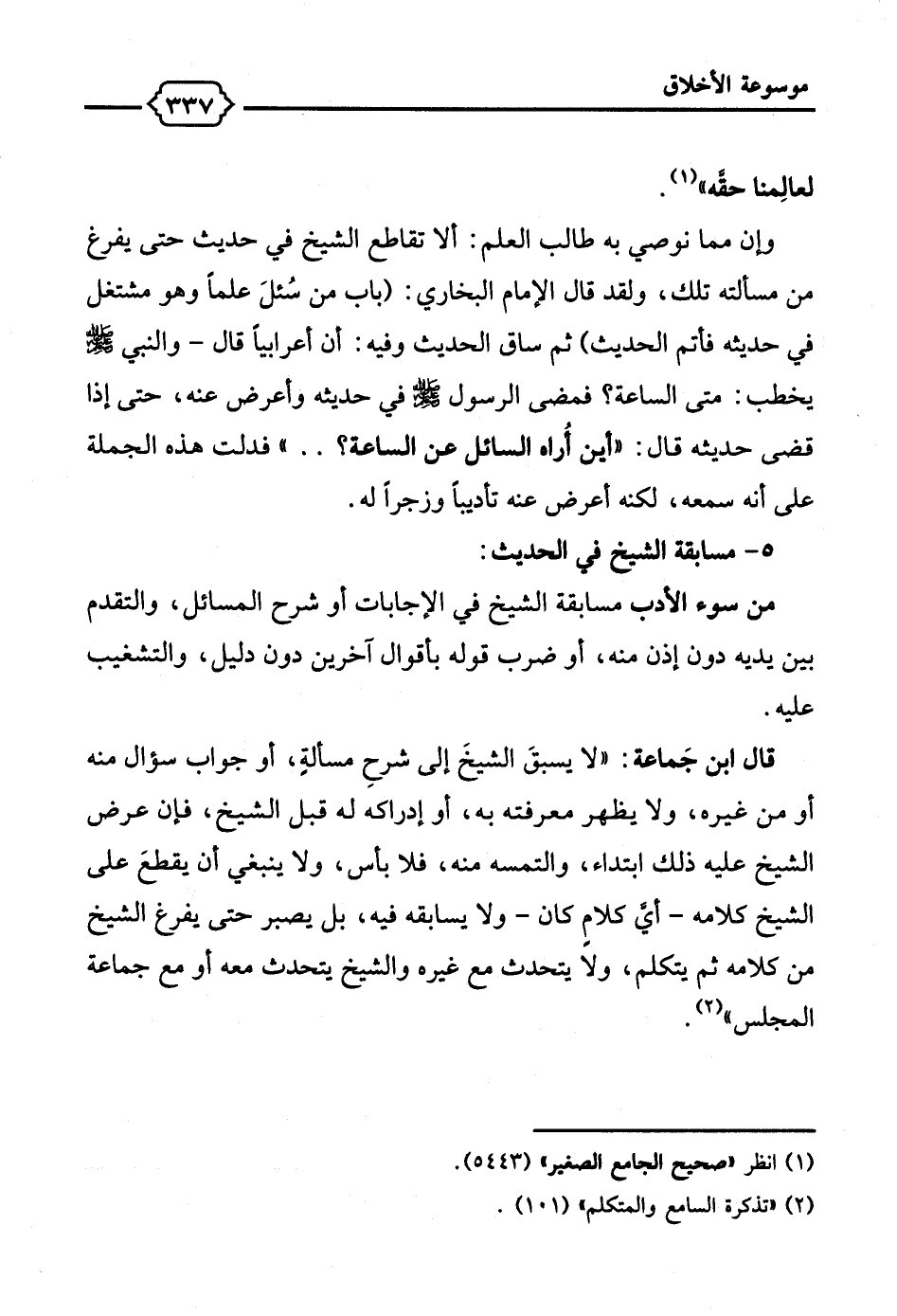 وإن مما نوصي به طالب العلم: ألا تقاطع الشيخ في حديث حتى يفرغ من مسألته تلك، ولقد قال الإمام البخاري: (باب من سُئلَ علمًا وهو مشتغل في حديثه فأتم الحديث) ثم ساق الحديث وفيه: أن أعرابيًا قال- والنبي - صلى الله عليه وسلم- يخطب: متى الساعة؟ فمضى الرسول - صلى الله عليه وسلم - في حديثه وأعرض عنه، حتى إذا قضى حديثه قال: "أين أُراه السائل عن الساعة؟ .. " فدلت هذه الجملة على أنه سمعه، لكنه أعرض عنه تأديبًا وزجرًا له.