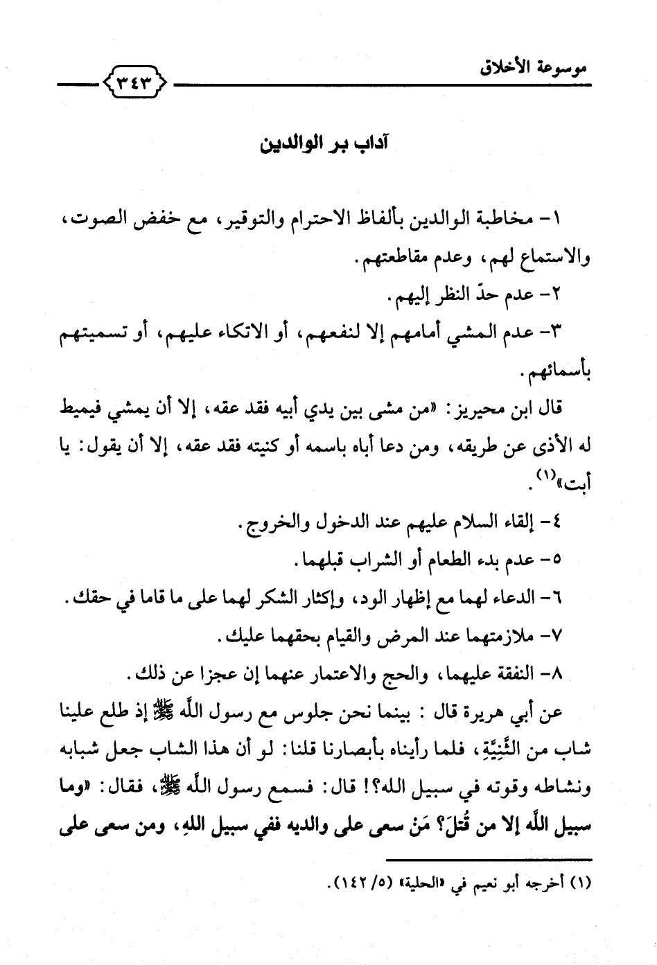 عن أبي هريرة قال: بينما نحن جلوس مع رسول الله - صلى الله عليه وسلم - إذ طلع علينا شاب من الثَّنِيَّةِ، فلما رأيناه بأبصارنا قلنا: لو أن هذا الشاب جعل شبابه ونشاطه وقوته في سبيل الله؟! قال: فسمع رسول الله - صلى الله عليه وسلم -، فقال: "وما سبيل الله إلا من قُتلَ؟ مَن سعى علي والديه ففى سبيل اللهِ، ومن سعى علي