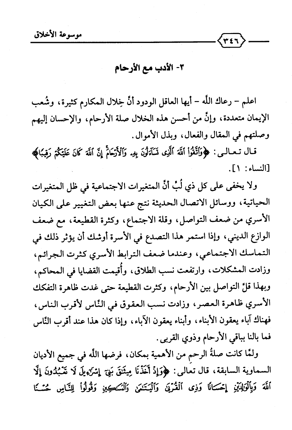 اعلم- رعاك الله- أيها العاقل الودود أن خِلال المكارم كثيرة، وشُعب الإيمان متعددة، وإن من أحسن هذه الخلال صلة الأرحام، والإحسان إليهم وصلتهم في المقال والفعال، وبذل الأموال.