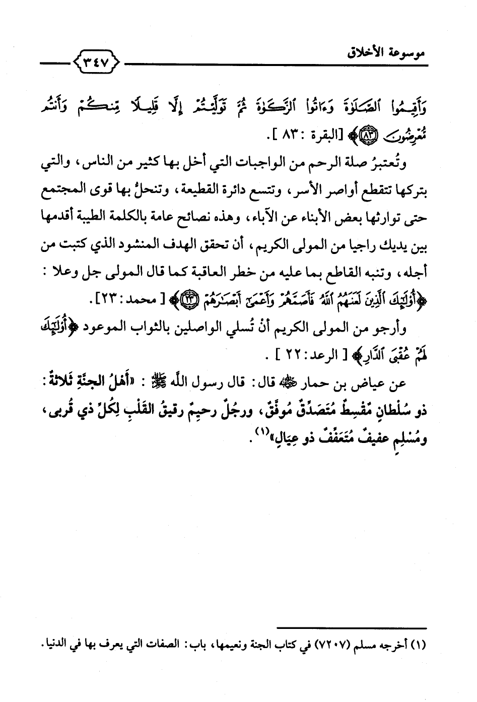 عن عياض بن حمار - رضي الله عنه - قال: قال رسول الله - صلى الله عليه وسلم -: "أَهلُ الجنَّةِ ثَلاثةٌ: ذو سُلطانِ مقسِطٌ مُتَصدق مُوفَّقٌ، ورجُل رحيِم رقيقُ القَلبِ لِكُل ذي قُربى، ومُسلِمِ عفيف مُتَعَفِّف ذو عِيَالٍ" (¬1).