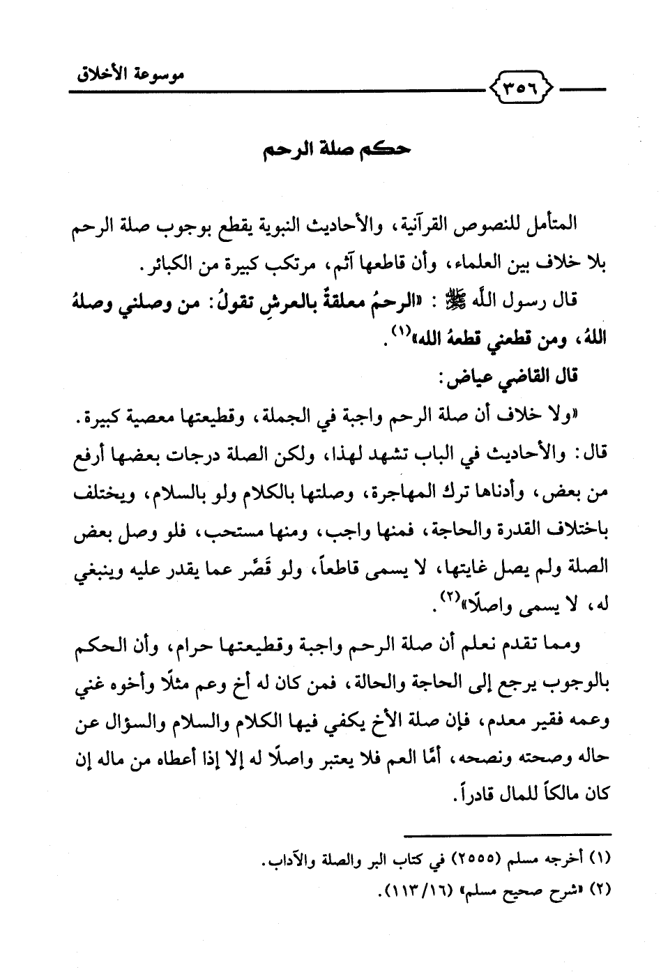 "ولا خلاف أن صلة الرحم واجبة في الجملة، وقطيعتها معصية كبيرة. قال: والأحاديث في الباب تشهد لهذا، ولكن الصلة درجات بعضها أرفع من بعض، وأدناها ترك المهاجرة، وصلتها بالكلام ولو بالسلام، ويختلف باختلاف القدرة والحاجة، فمنها واجب، ومنها مستحب، فلو وصل بعض الصلة ولم يصل غايتها، لا يسمى قاطعًا، ولو قَصَّر عما يقدر عليه وينبغي له، لا يسمى واصلًا" (¬2).
